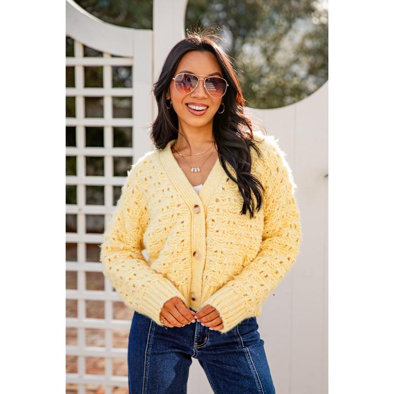 This soft Honeyed Heart Chunky Yellow Knit Cardigan is pure cozy romance. Featuring a textured open-knit body, relaxed fit, and classic button front, it’s the kind of layer you reach for when you want warmth with charm. Easy to throw on over tees, dresses, or knits, this piece brings a soft glow to any Valentine-inspired look.
