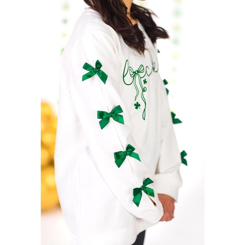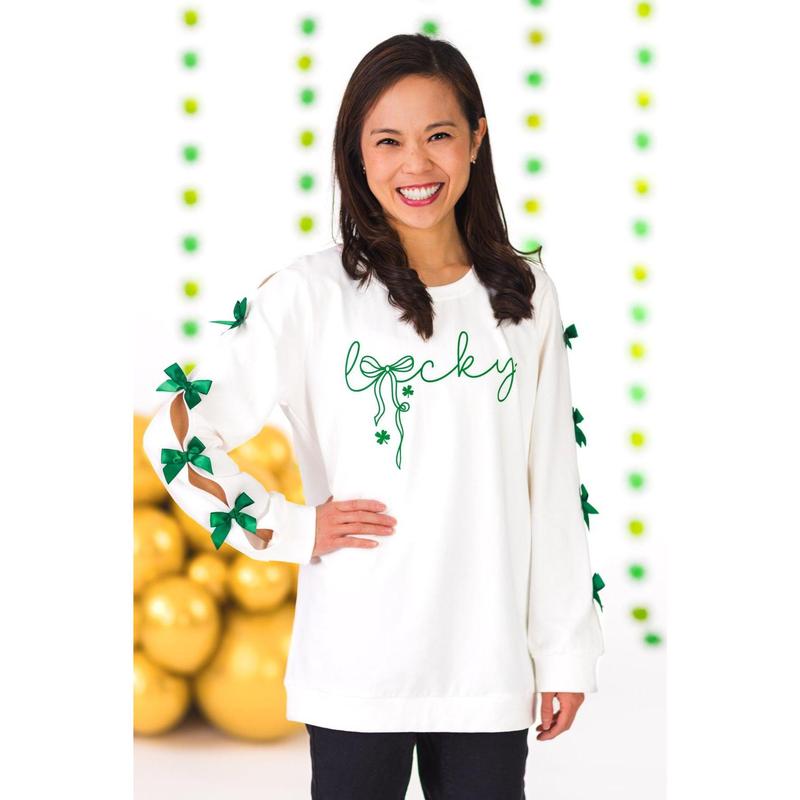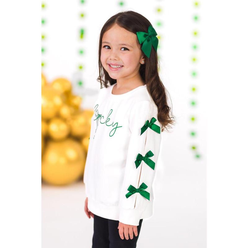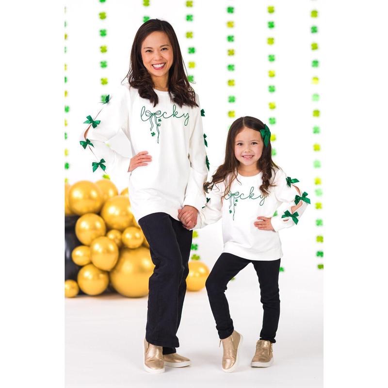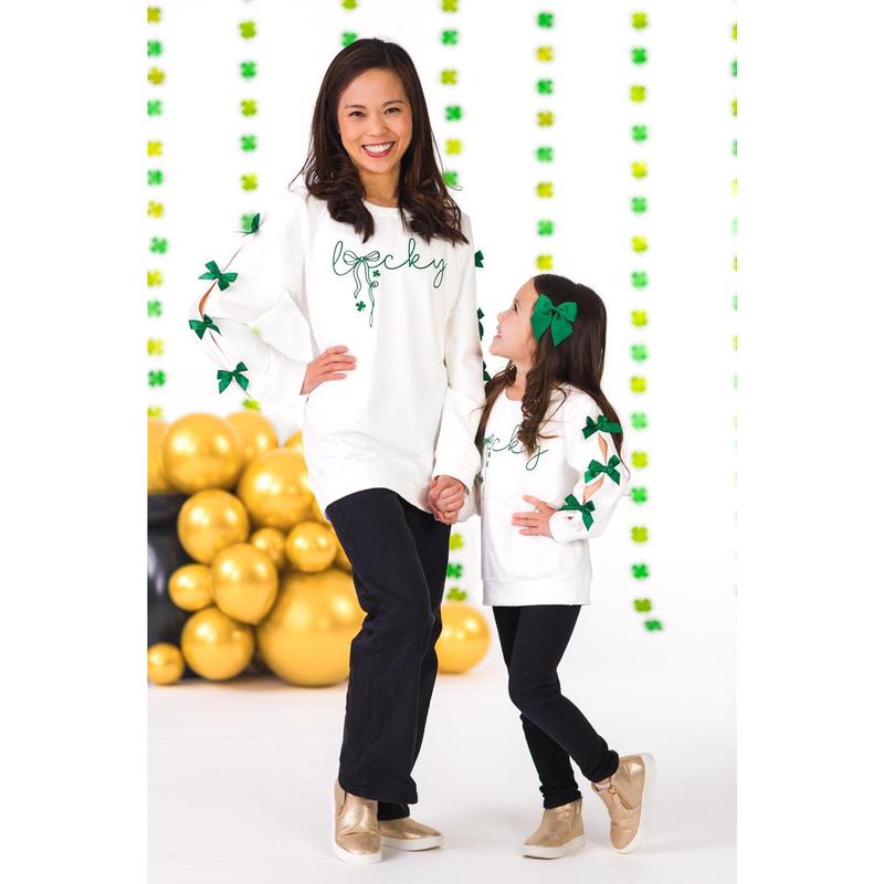 Twinning is winning this St. Patrick's Day! Match with your little one in our in our "Lucky" Bow Top. These long sleeve tops features "Lucky" on the front with bow details down the sleeves. The breathable fabric makes for cool and comfy wear, while the pull-over style allows for simple dressing. She can pair it with a variety of SIP accessories & our booties for the perfect look! Check out our mom & me collection for more twinning tops/sets for you and your little one!