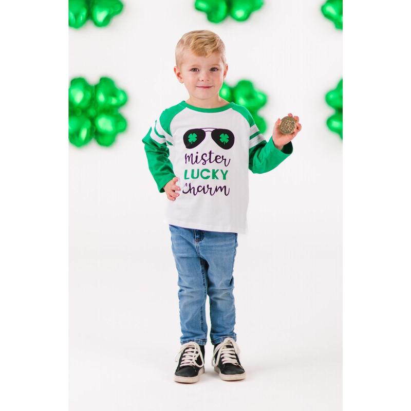 Your lucky one will have a shamrockin' time this holiday in our "Mister Lucky Charm" T-Shirt for boys. Made from a lightweight fabric, this long sleeve shirt ensures he stays comfy throughout the day. It features a cute shamrock sunglasses design making it a perfect fit for the holiday. This top makes a great pairing piece with a variety of his bottoms, he can also layer it under his zip-up jackets to stay cozy on the cooler days.