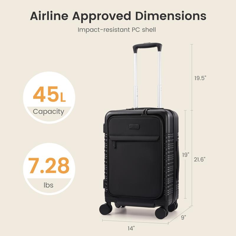 LOVEVOOK carry-on luggage features front pockets for quick retrieval of essentials like laptops (up to 15.6"), passports, and phones. It includes a side hook for hanging small bags, keeping your hands free.
