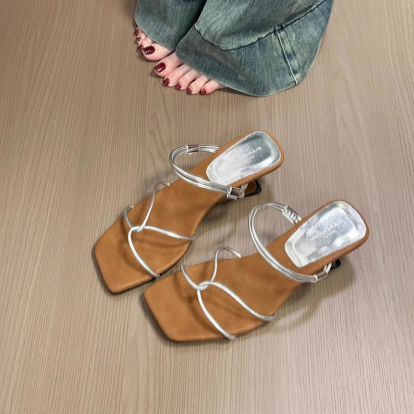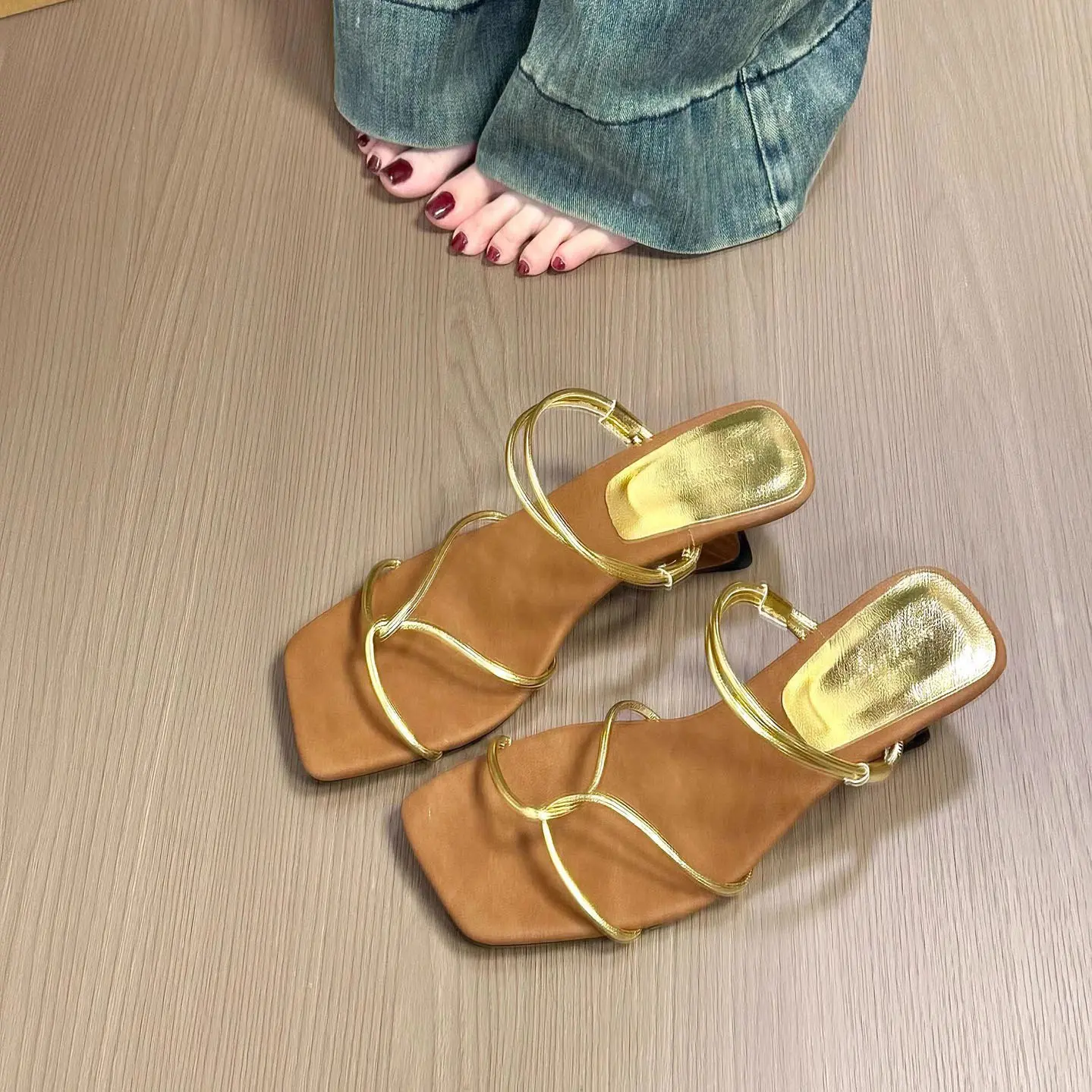 Features a sleek square toe that visually slims the foot shape. Slim metallic cross straps in gold, silver, or black add texture and a nostalgic Y2K flair. The layered strap design makes it a standout choice for retro-inspired outfits.