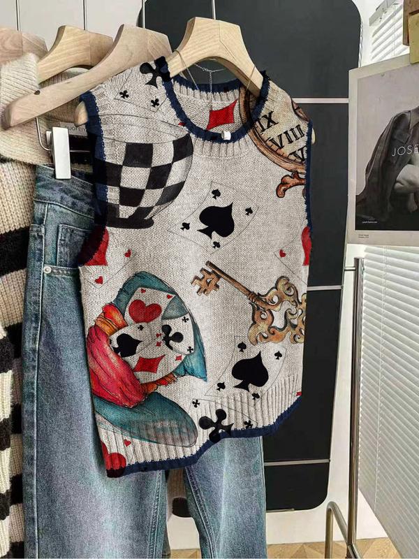 1 piece + Spring/Summer Back-to-School Casual Style Loose Round-neck Sleeveless Knitted Dark Blue Embroidered Color-Contrast Patchwork Print Women's Knitted Top for Outfits, Women's Outerwear, to be worn alone or paired with a jacket