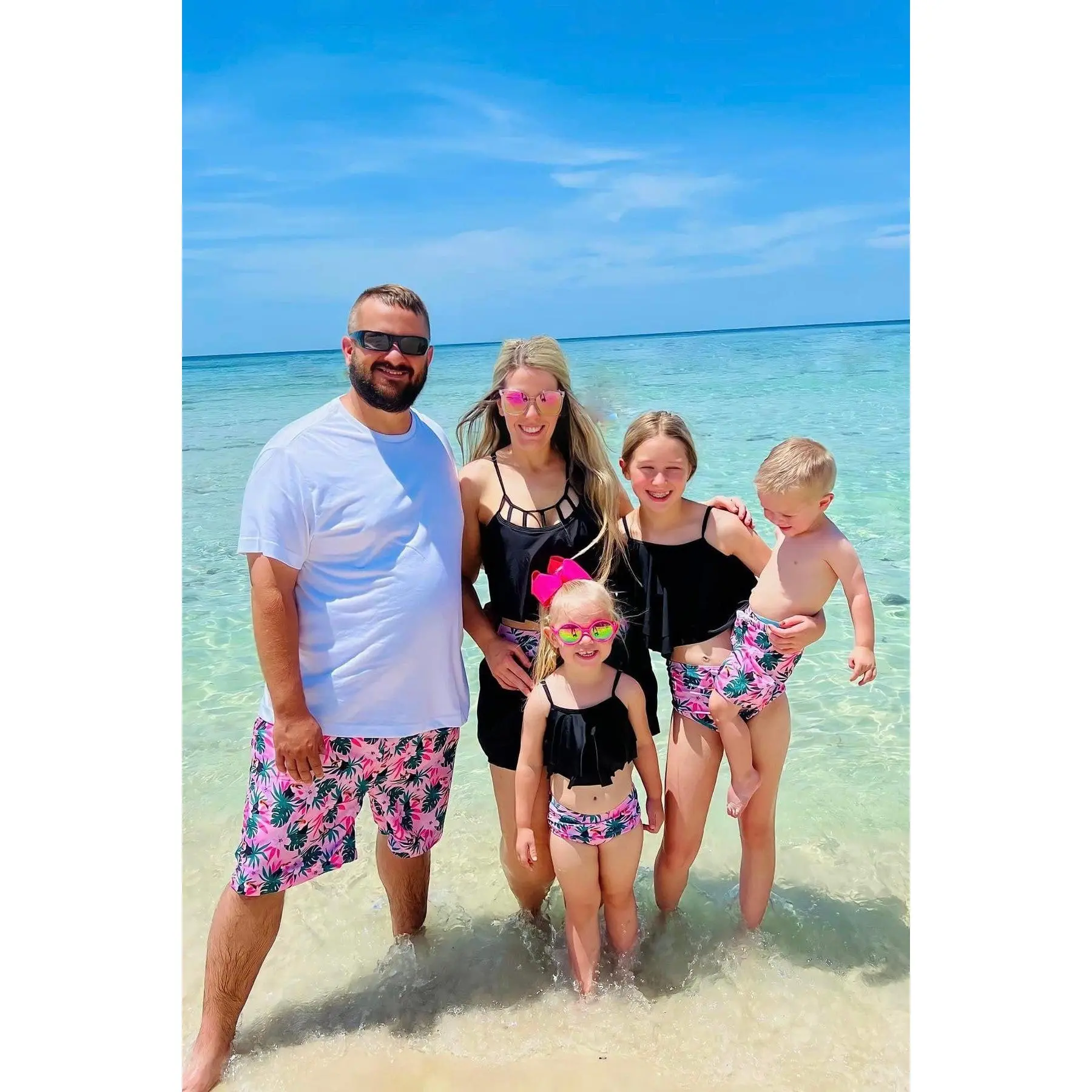 Vivid and bright colored fabric is perfect for the whole family. Mom features a two piece design with black top and the bottoms feature a tropical print. The girls suit also features a two piece design with a black & tropical print with feminine ruffle overlay. The boys' and mens' suits feature a standard swim bottom design with stretch waist and matching tropical print. You can pair this swimsuit with sandals and a pair of sunnies for a fun beachy look.