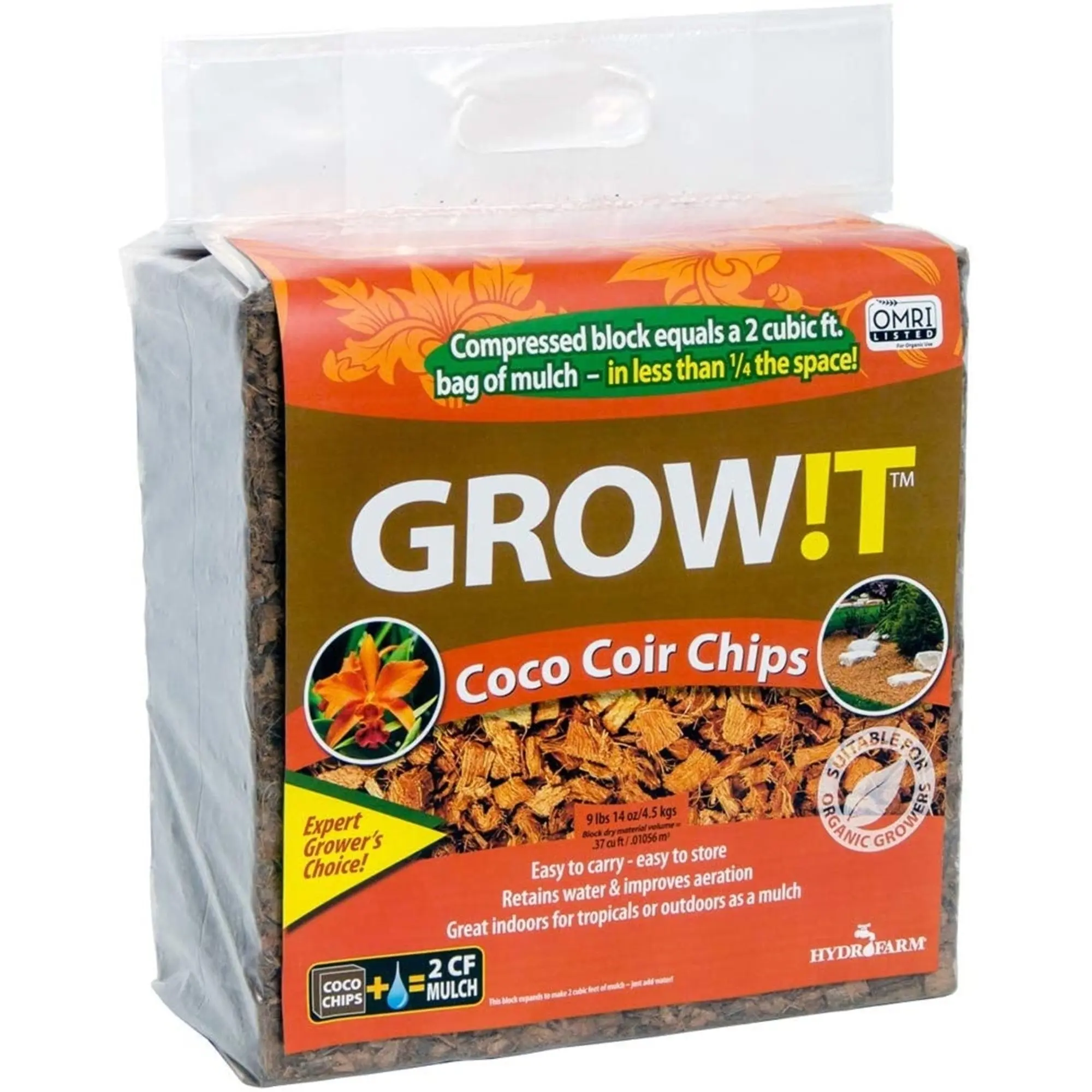 Use GROW!T organic coco coir planting chips to promote growthfor tropical flowers and plants. It works both indoors and outdoors and isideal for mulching and a decorative ground cover that retains water and resistsfungus. Although each block of chips is equivalent to more than 2 cubic feet ofmulch, it is lightweight and easy to carry and store. Add the GROW!T mix intoyour growing system and notice the coco difference!