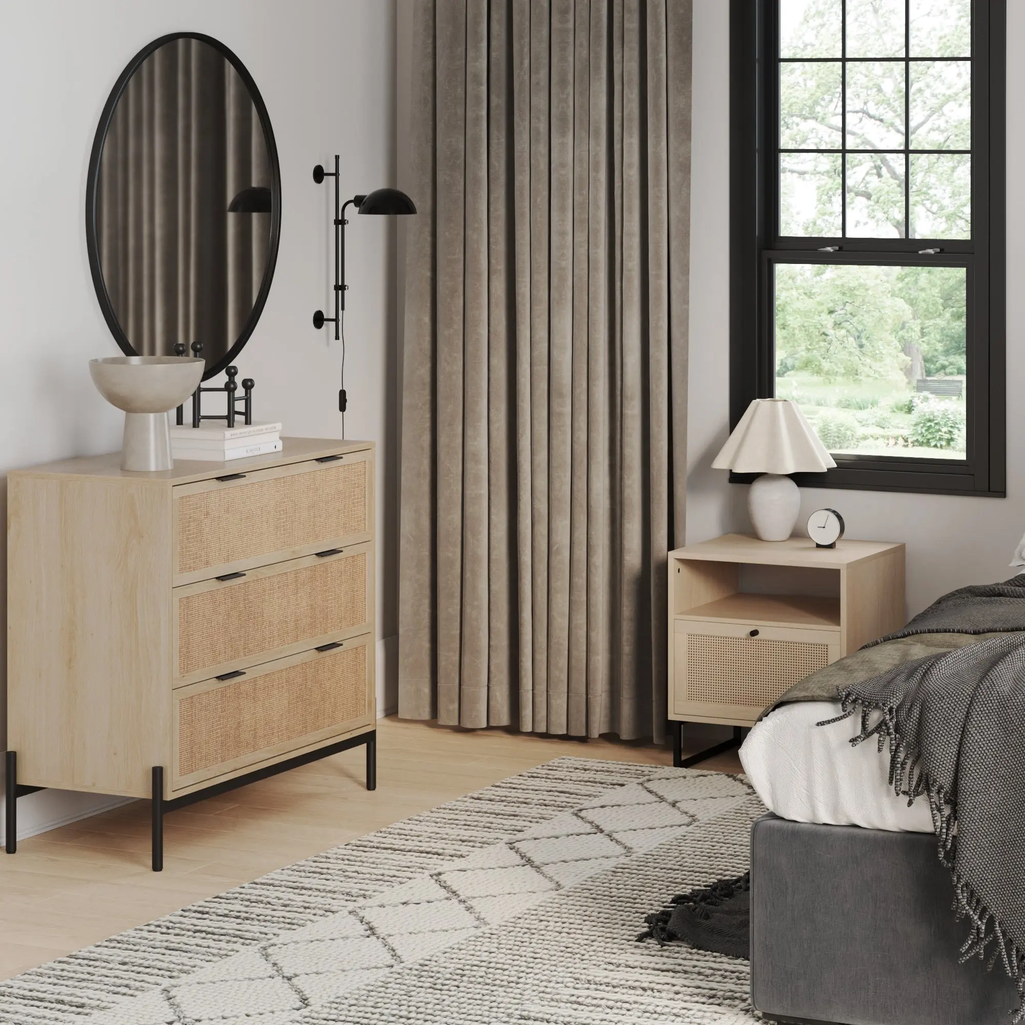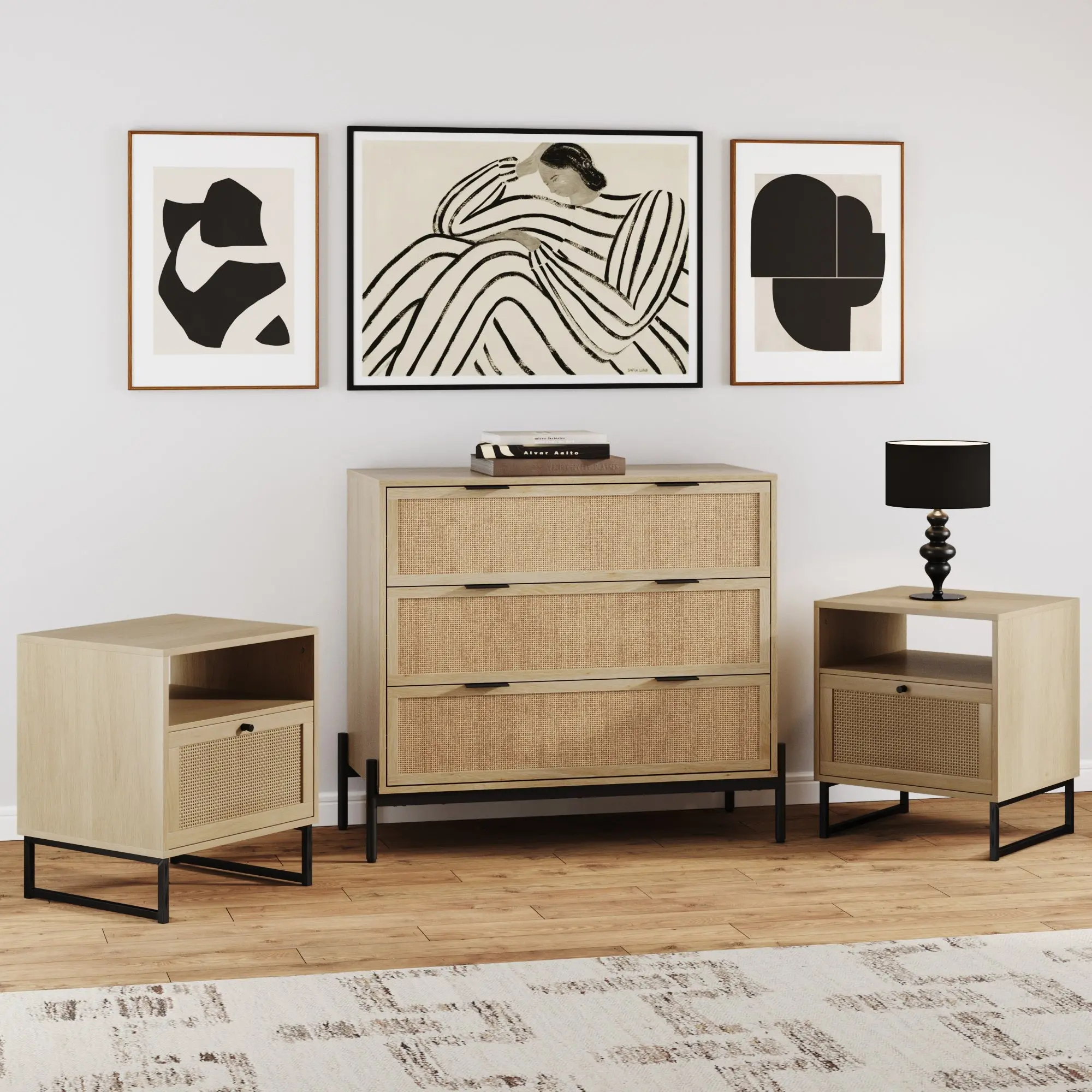 Meet Andrew, a stylish dresser and nightstand set with a powder-coated metal base and natural rattan fronts. Adjustable legs let units sit flush side-by-side, and safety features keep things secure. With smooth slides and a unique, crafted design, each piece adds charm to your space.