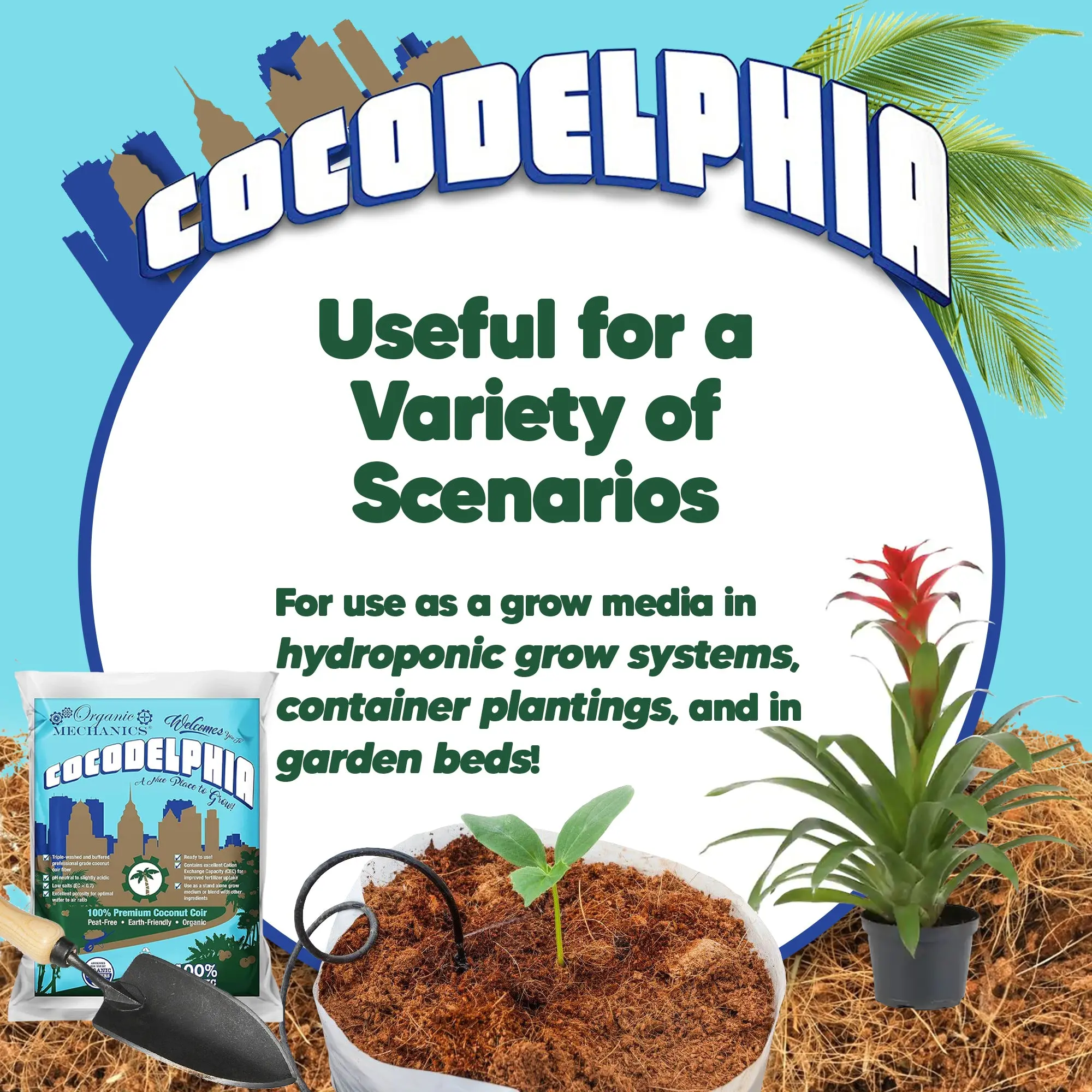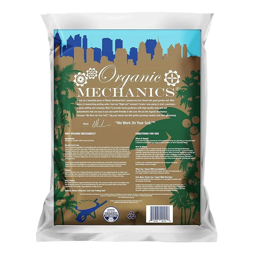 Organic Mechanics Cocodelphia is 100% premium pure coconut coir. Triple washed and buffered, this professional grade coco is ready to use right out of the bag. Excellent porosity for optimal water to air ratio. Contains excellent Cation Exchange Capacity (CEC) for increased nutrient uptake. If desired, mix in beneficial ingredients, such as our Biochar Blend, Insect Frass, Fuhgeddaboudit! Root Zone Feeder Packs, or Worm Castings. If growing in pure coco, make sure to use a calcium and magnesium supplement for best results. Low salt levels less than 0.7. Organic Mechanics compost- based soils do not break down as quickly as peat-based mixes. Simply fluff the mix back up, remove any large root balls, and replant.