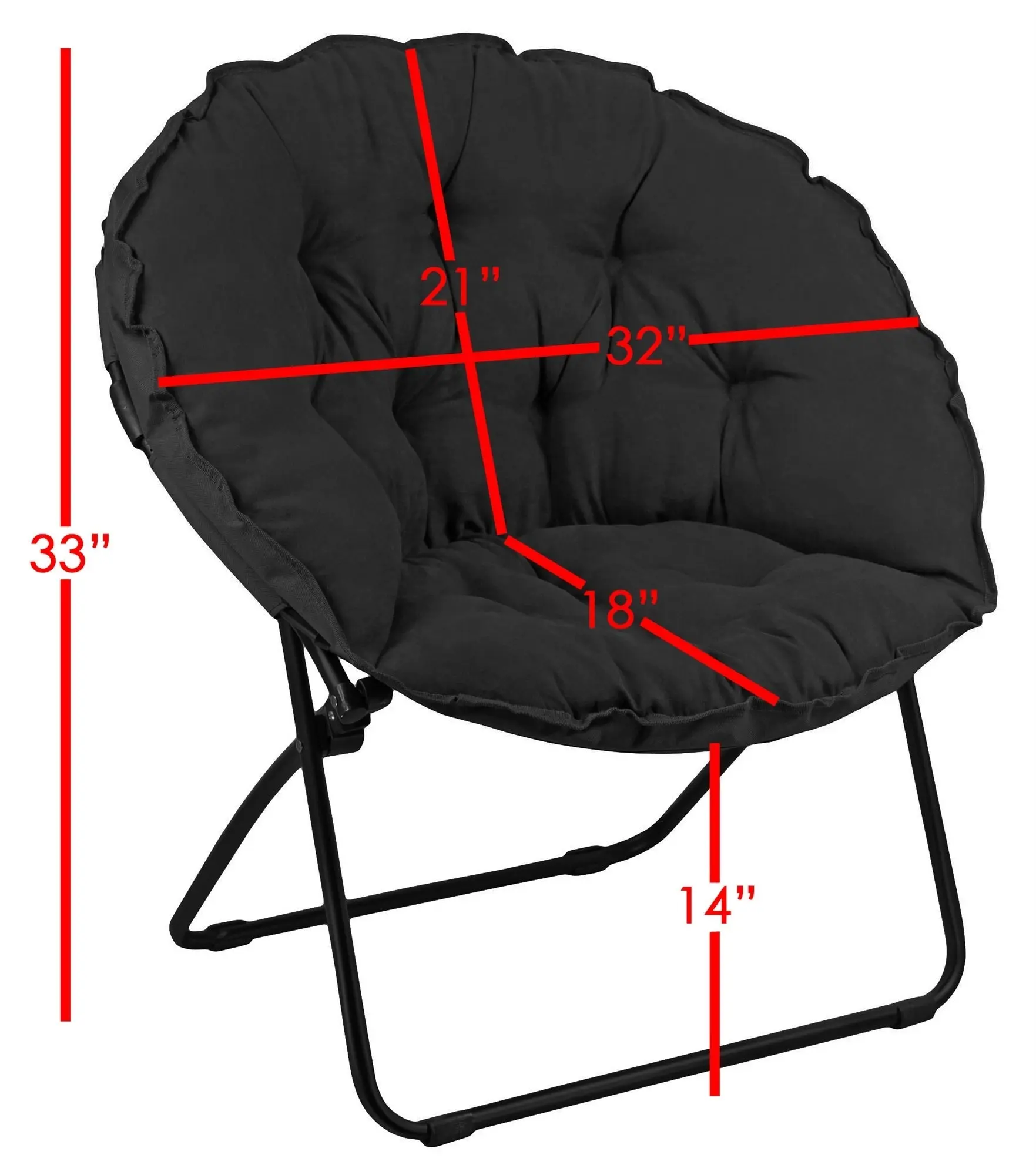 Compliment your dorm or bedroom with this soft and comfortable Saucer Chair. Super comfortable, this padded, microfiber folding chair is perfect for reading, watching TV or just relaxing. This cozy saucer chair is a perfect decorative addition to update or complete any room. Chair easily folds up and can be stored without taking up much space when not in use. Sturdy metal frame with a weight capacity of 225 pounds. Suitable for lounging, dorms or any room. Great when paired with another!
