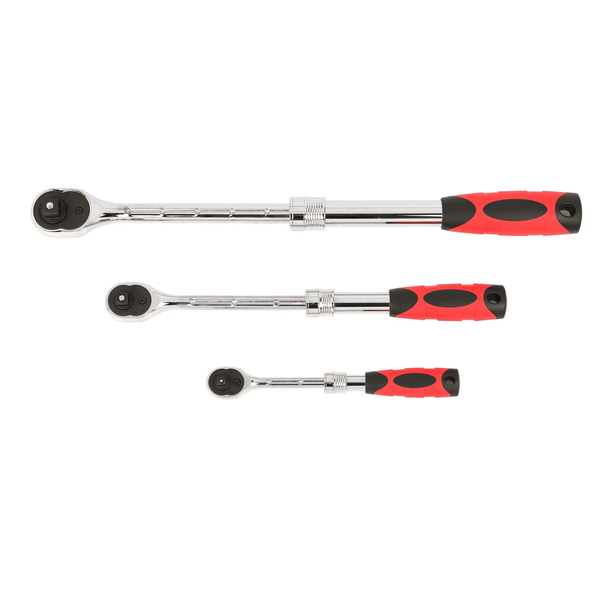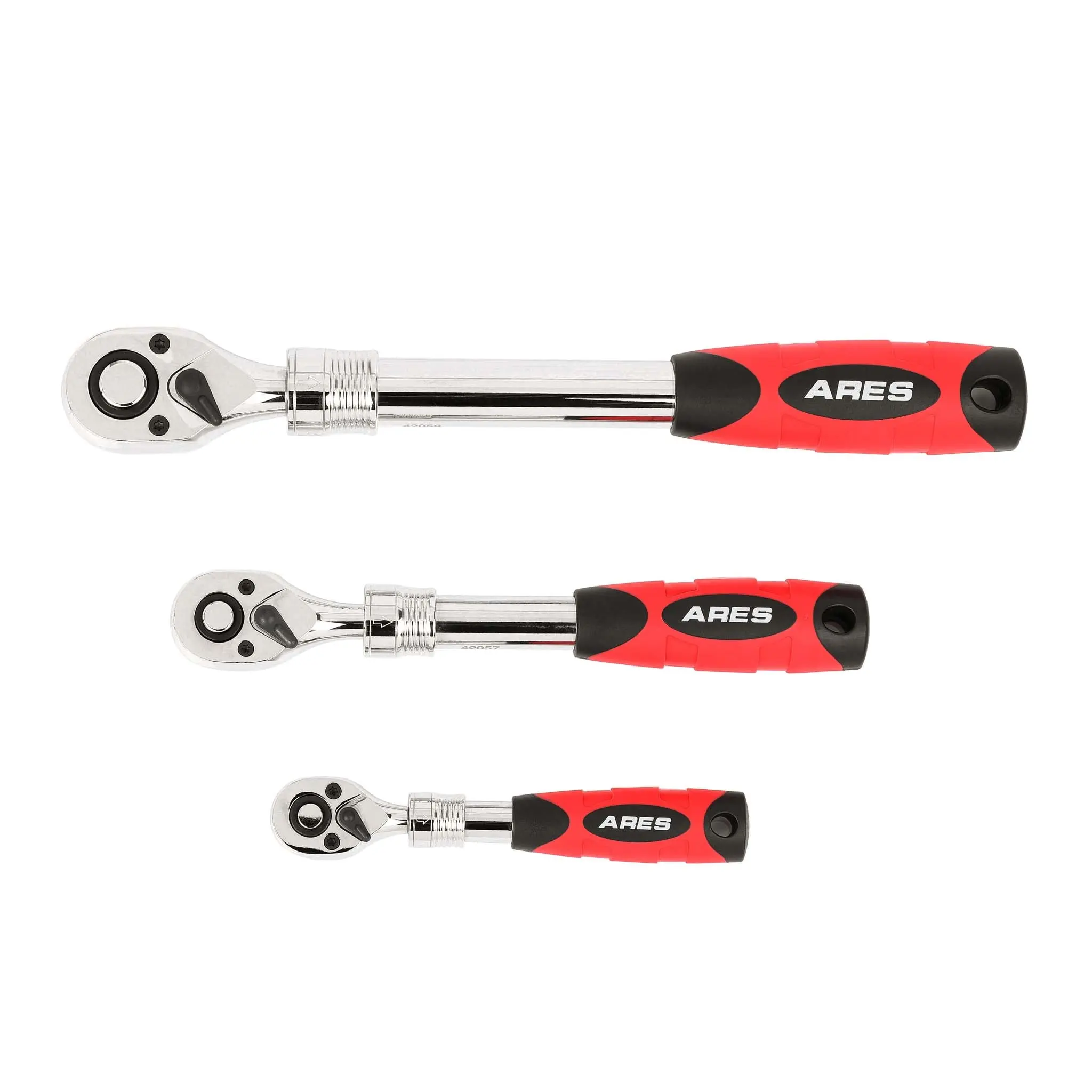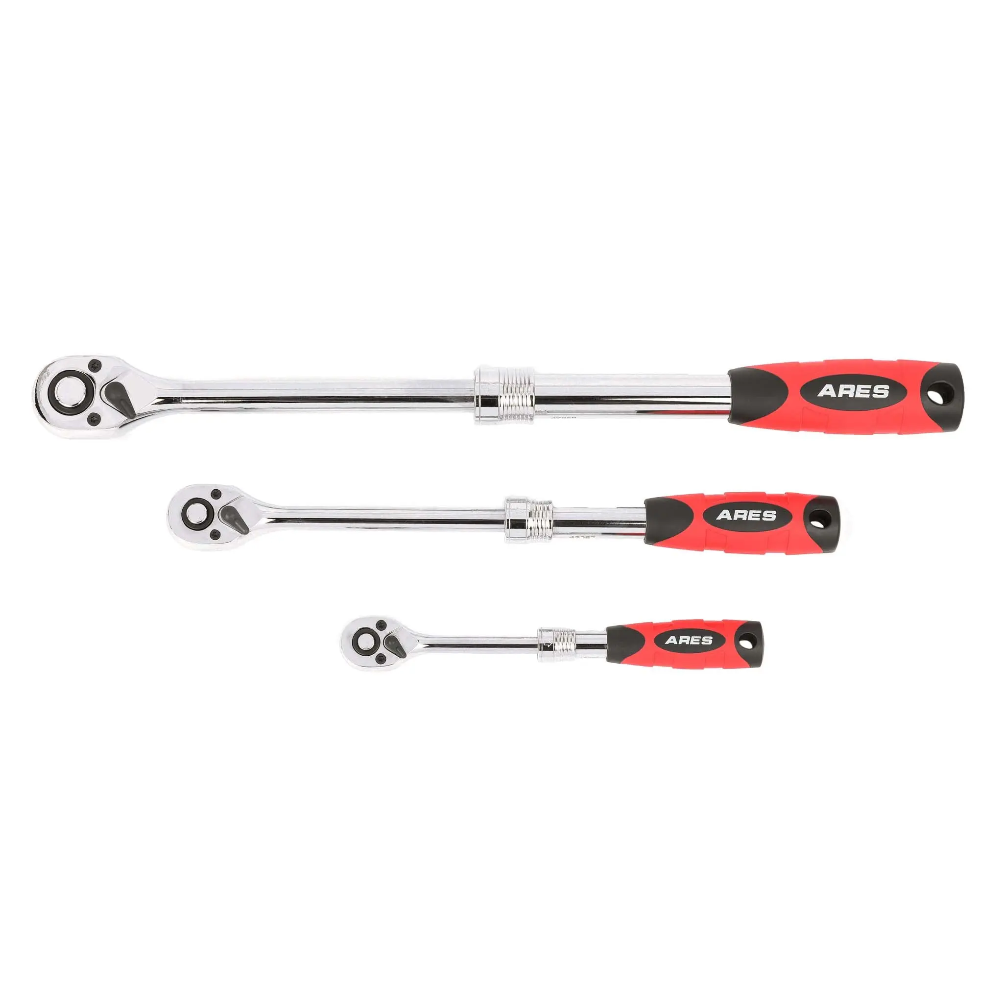 The ARES 3-Piece 72-Tooth Extendable Ratchet Set includes three extendable ratchets in 1/4-inch, 3/8-inch, and 1/2-inch drive. Each ratchet quickly and easily telescopes, then locks securely into the length you need it at for reliable use in hard to reach places. Each ratchet is constructed from premium Chrome Vanadium steel with a corrosion resistant Mirror Polish Chrome plated finish for long lasting durability. The ergonomic double injection comfort grip handle ensures a tight hold and prevents hand fatigue during prolonged use. Thanks to the quick and easy reversible thumb switch, you can change direction instantly, and sockets easily lock onto the quick-release drive tang, so you know they won't fall off on the job or get stuck on fastener heads.