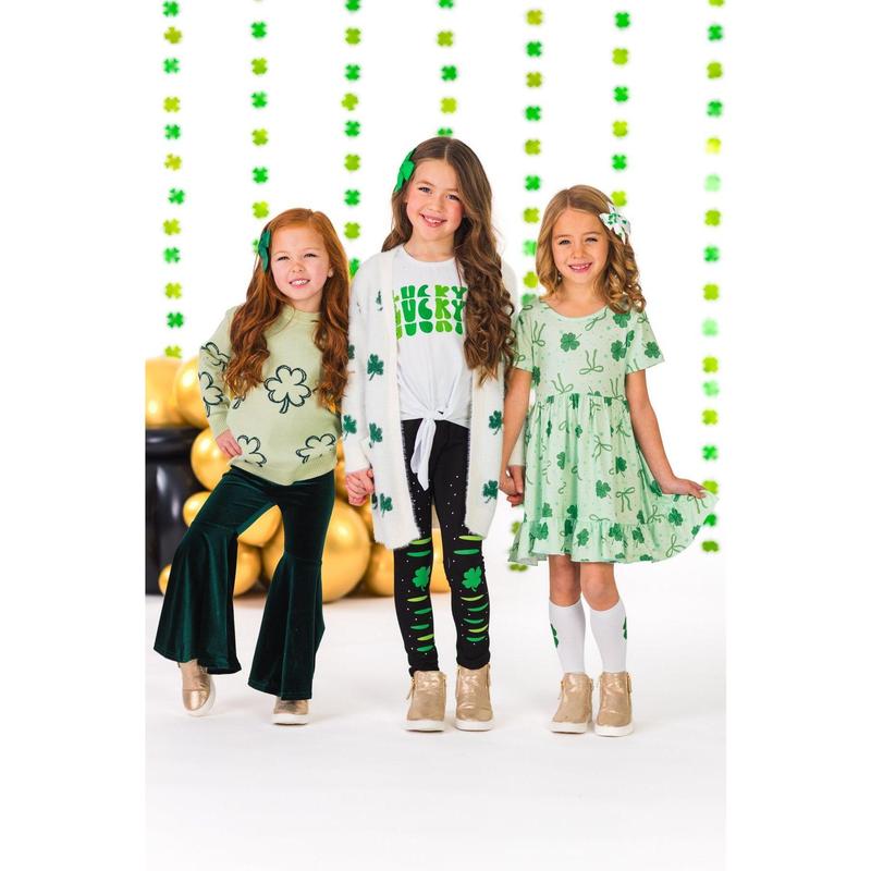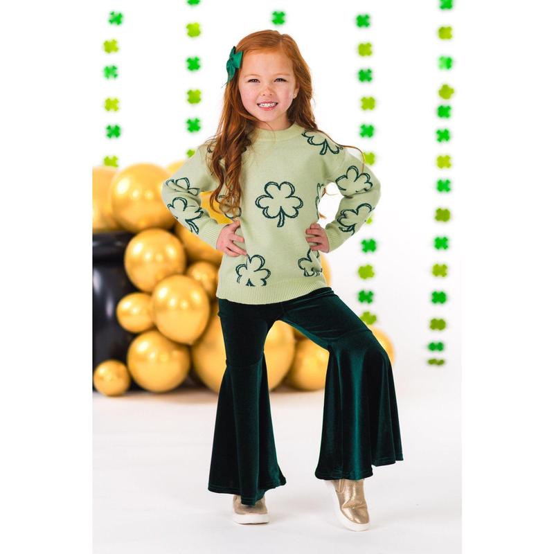 Your lucky little one will have a shamrockin' good time in our Shamrock Sweater Velvet Bell Bottom Set. The sweater features green shamrocks allover and looks adorable paired with the matching bell bottoms. The stretchy waistband helps comfort and fit and can be great for on the go, while the velvet adds fun flair. She can pair this set with booties or our SIP bows for the perfect St. Patrick's Day look!