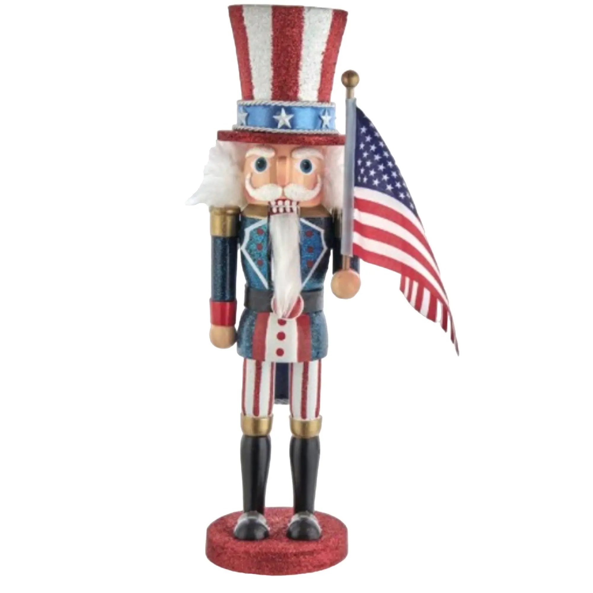 ·Festive and Fun Detailing: Dressed in a classic red, white, and blue outfit with an American flag top hat, this nutcracker proudly waves the U.S. flag for a bold patriotic statement