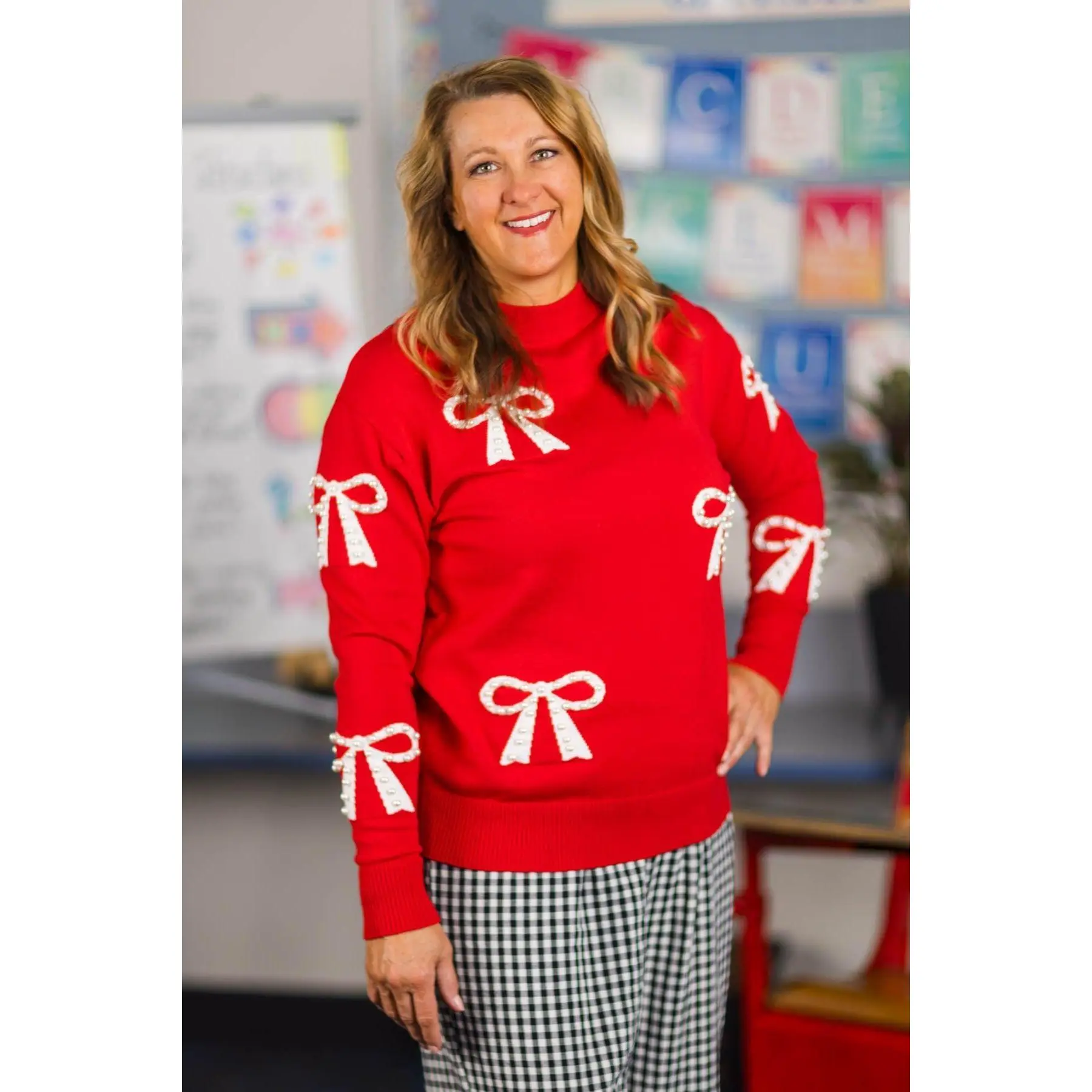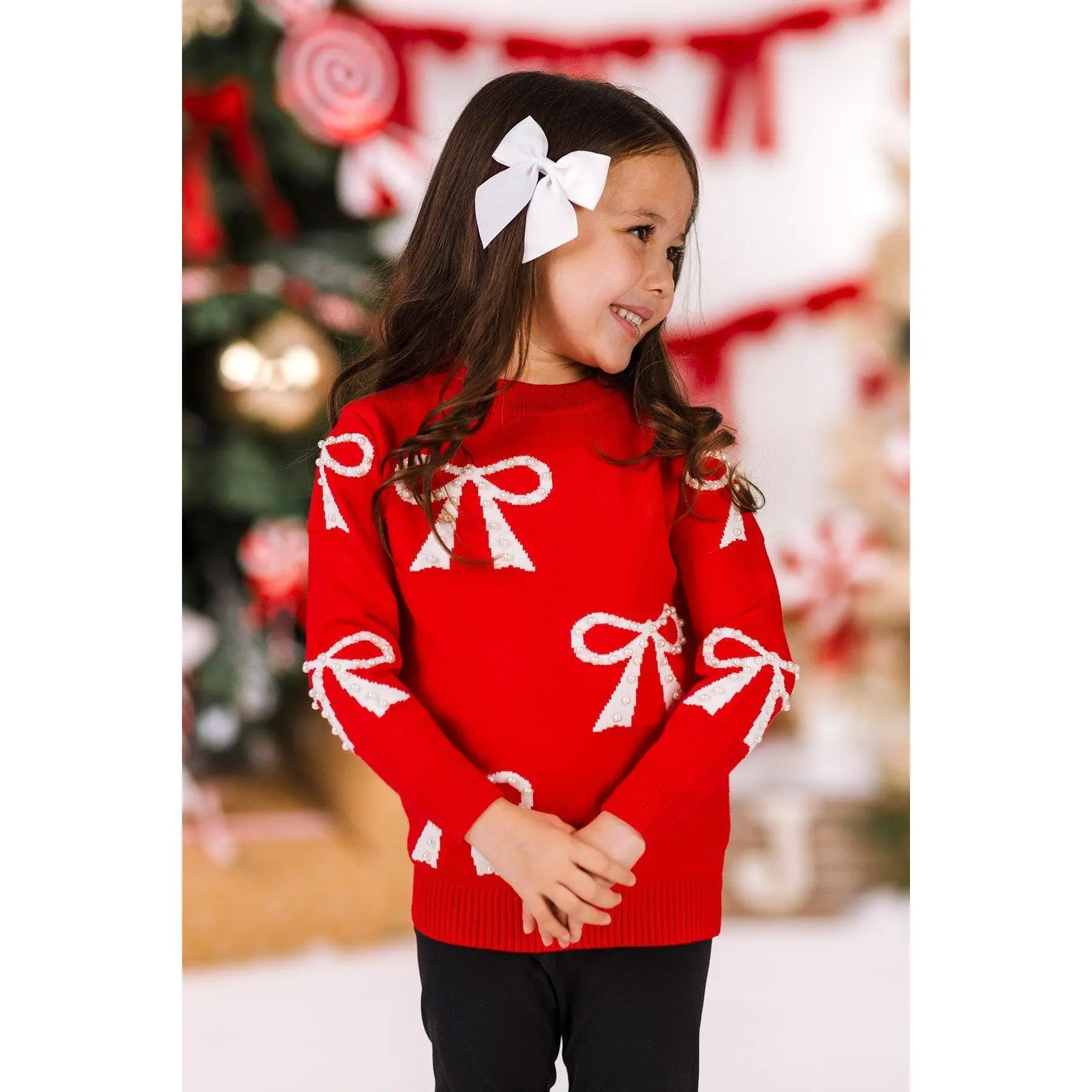Red bow sweater come to life in this sweater made for you and your little one. The soft knit material feels gentle against the skin and offers easy stretch so you can move and play comfortably together. Long sleeves and a relaxed, easy-to-layer fit make styling simple with your favorite jeans, leggings, or skirts. From everyday outings and family fun, this matching look makes twinning with your little one feel extra special.