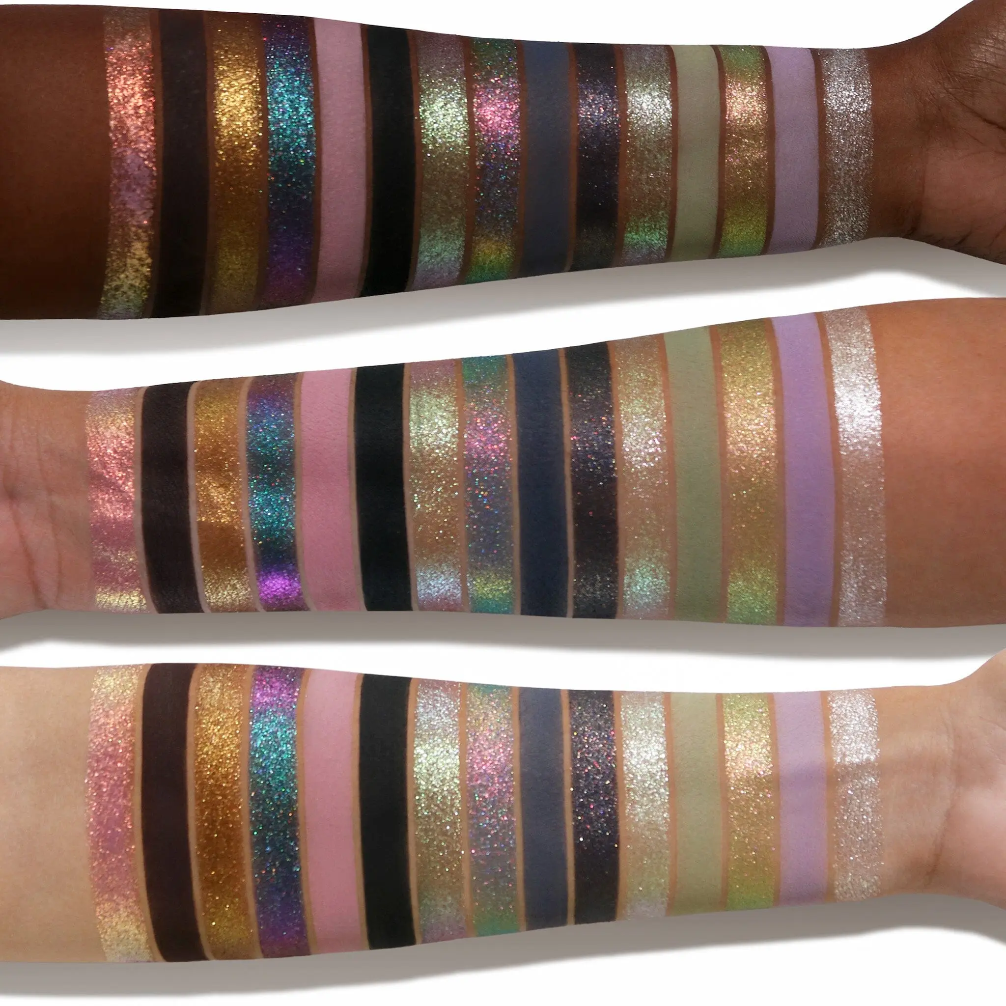 ·This palette contains extremely sparkly, very high pearl shimmers, including two multichromes, three holochromes, two duochromes and two multi dimensional shimmers -all of which consist of various textures. There are 6 buildable and blendable matte shades included to compliment your look. This new formula is thinner and more elegant than our older palettes from last year - similar to Minka 2025.