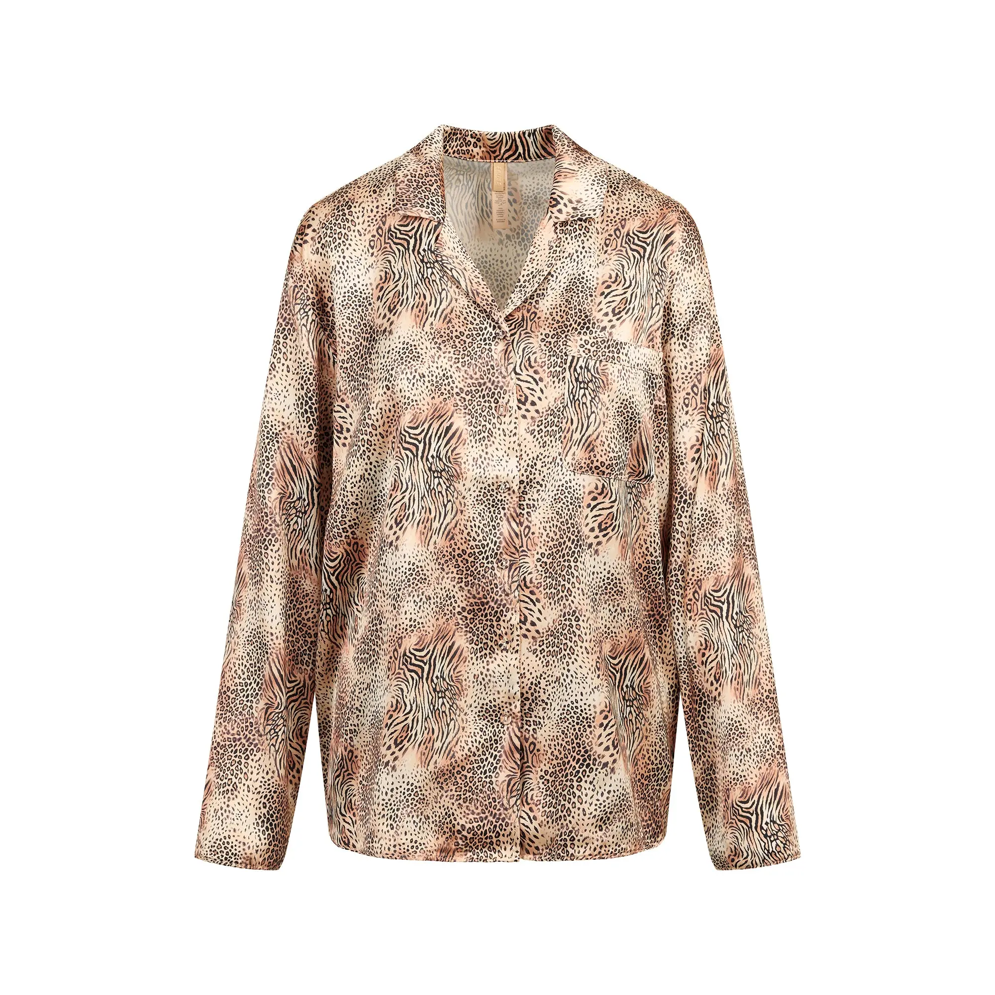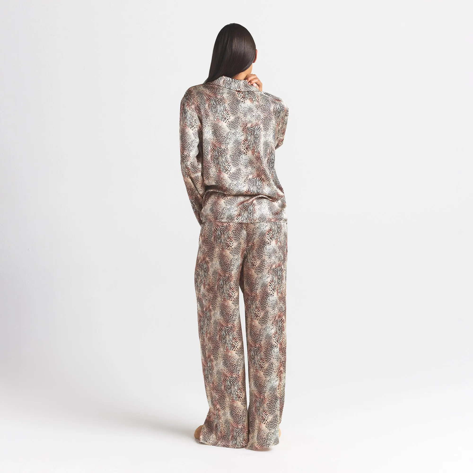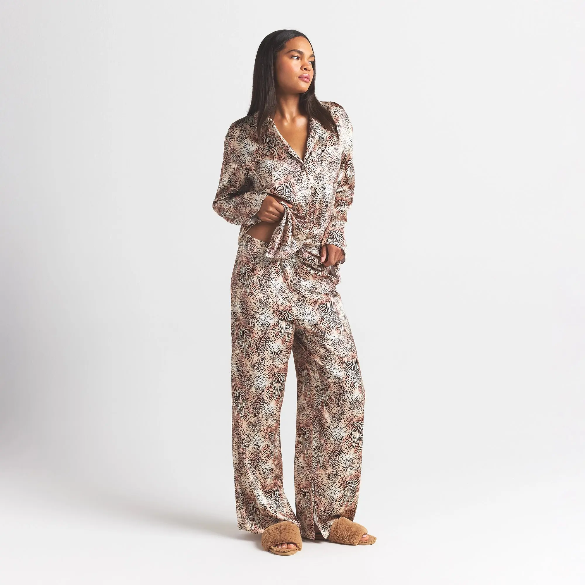 The secret to your most comfortable sleep. Made with our satiny Woven Shine fabric, this sweet two-piece set includes a long sleeve-button up with a chest pocket and center back logo label. The straight leg pant features an encased elastic waistband, interior adjustable drawstring, and slits at the sides.
