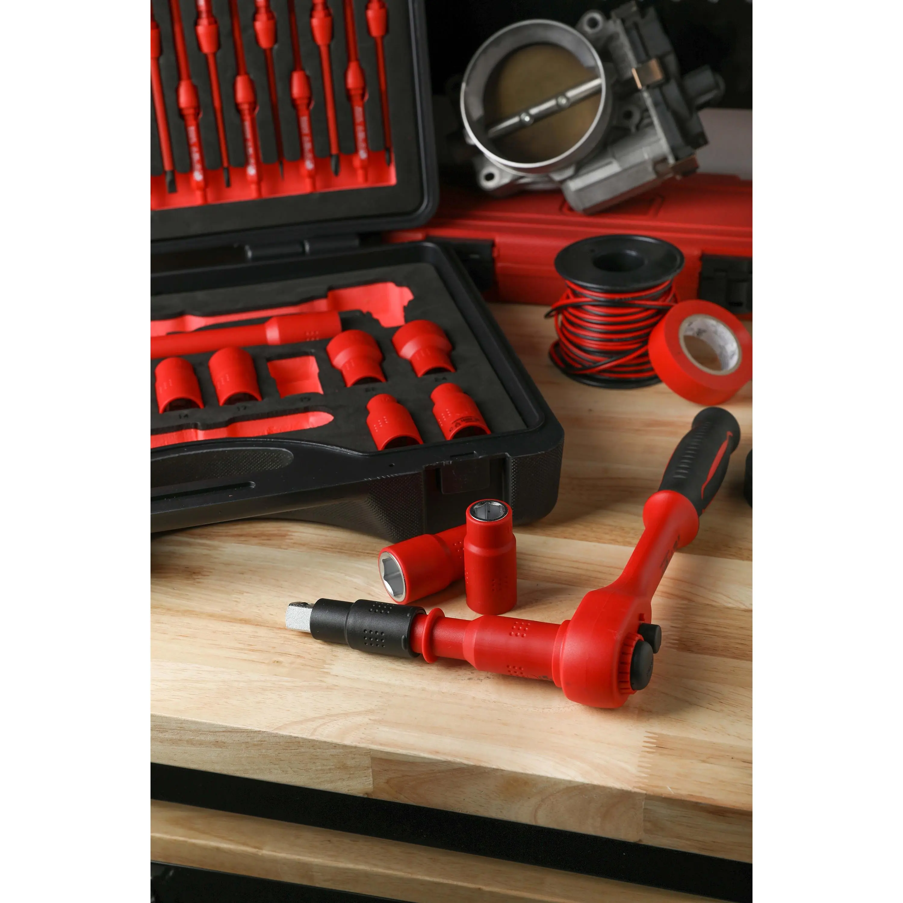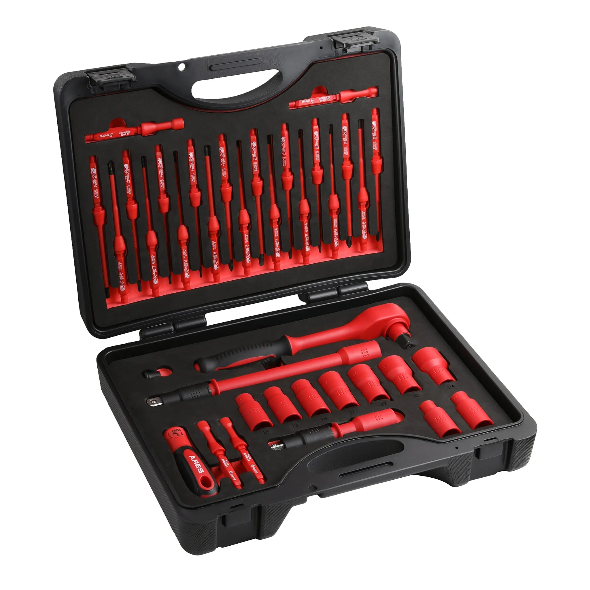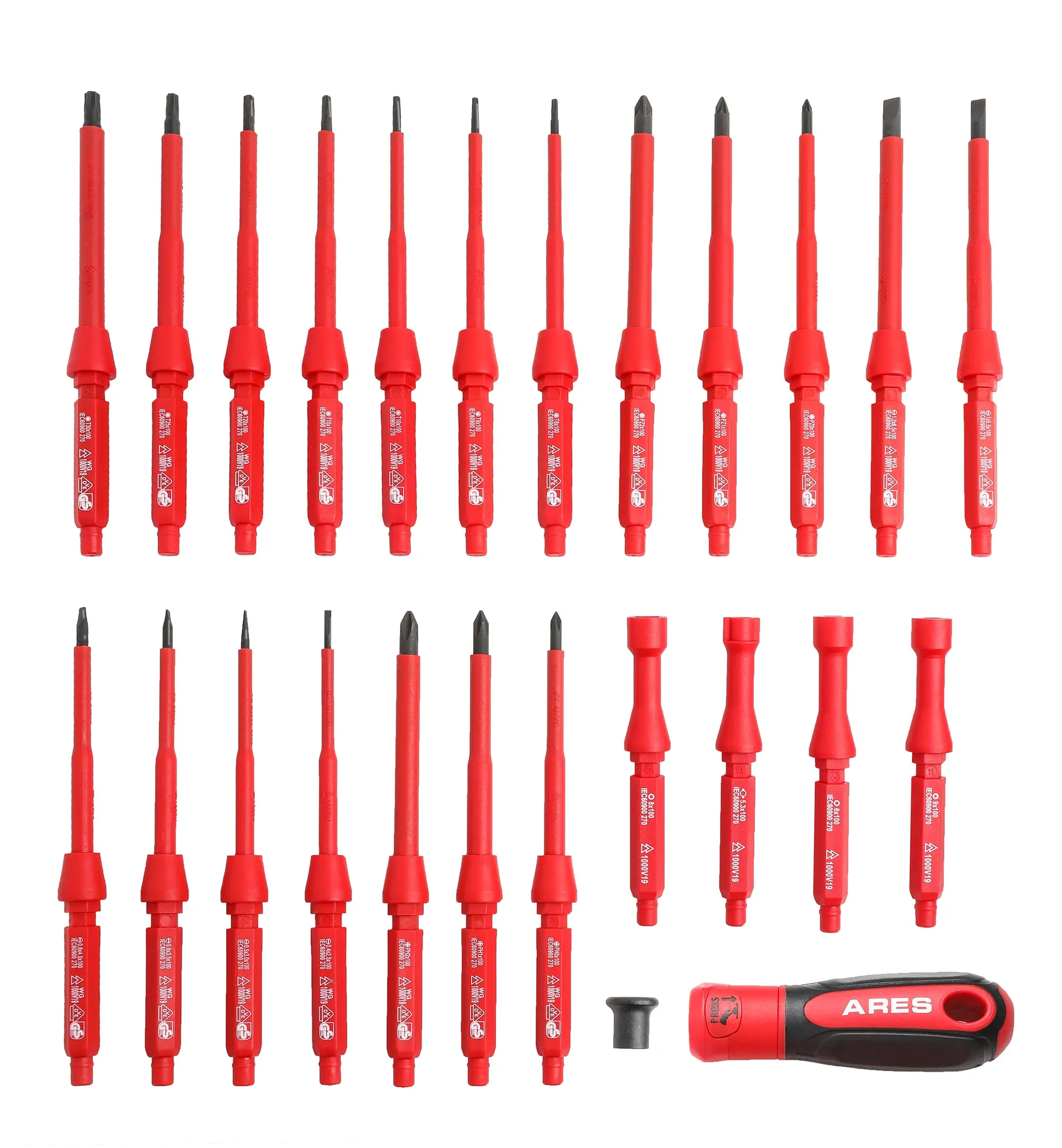 The ARES 37-Piece Insulated Electrical Tool Set features an ergonomic screwdriver handle with 19 interchangeable screwdriver shafts and 4 interchangeable cabinet keys, a 1/2-inch drive ratchet, two 1/2-inch drive extensions, and 9 sockets that all meet VDE standards and are GS certified up to 1000 volts, so you can safely get electrical work done. The ergonomically designed screwdriver and ratchet handles will help reduce hand fatigue during prolonged use and feature a quick release design so you can switch screwdriver shafts and sockets quickly and easily. This is a set you'll be able to count on time and time again.