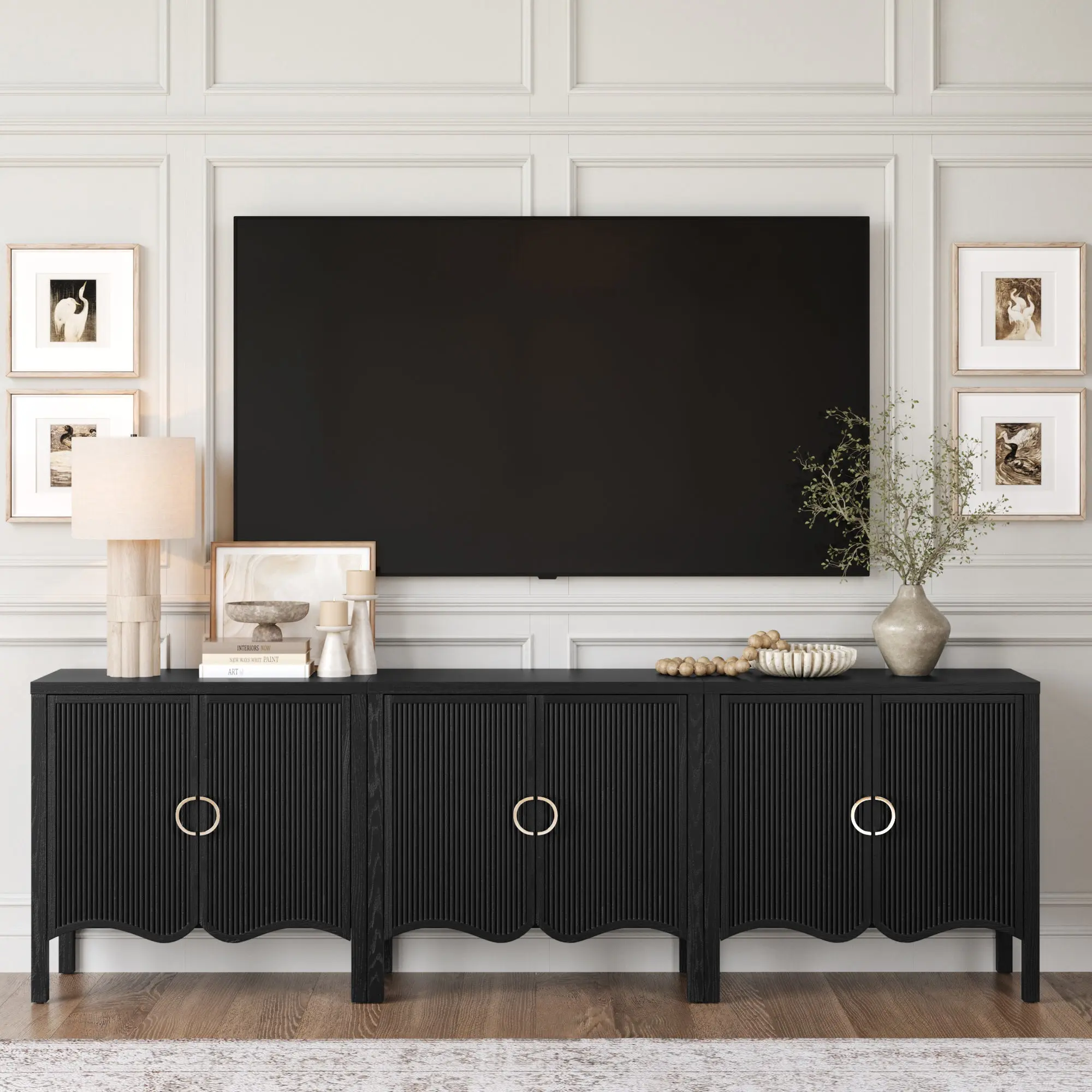The Scott Storage Cabinet in black oak brings a warm, transitional charm to your space. Its fluted doors feature a unique curved edge and circular pulls for an elegant, modern touch. Soft-close doors and cord access in the back add everyday convenience, while the solid wood leg frame ensures lasting durability. Finished in real wood veneer, each cabinet showcases one-of-a-kind variations in color and texture—and you can place multiple units side-by-side for a seamless look.