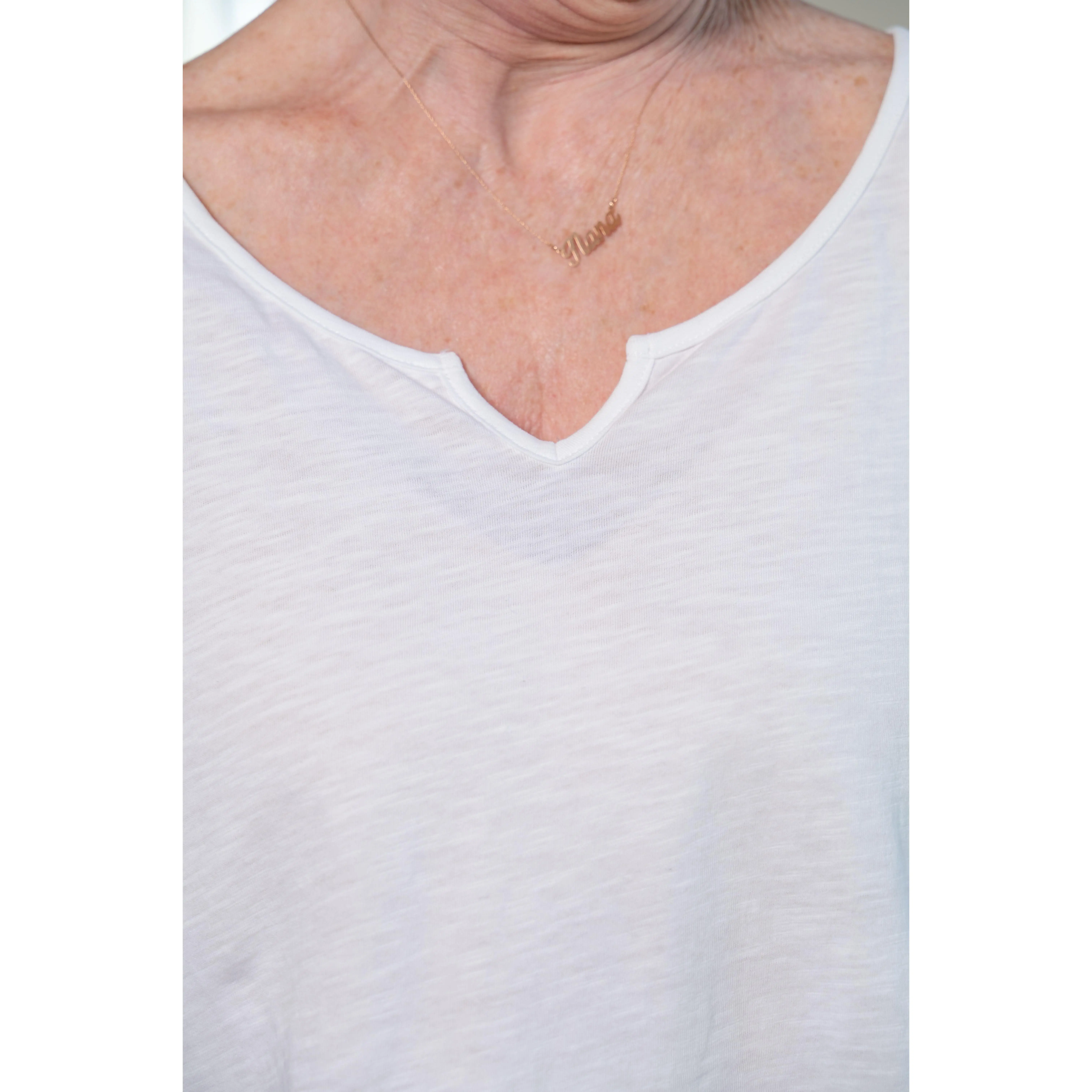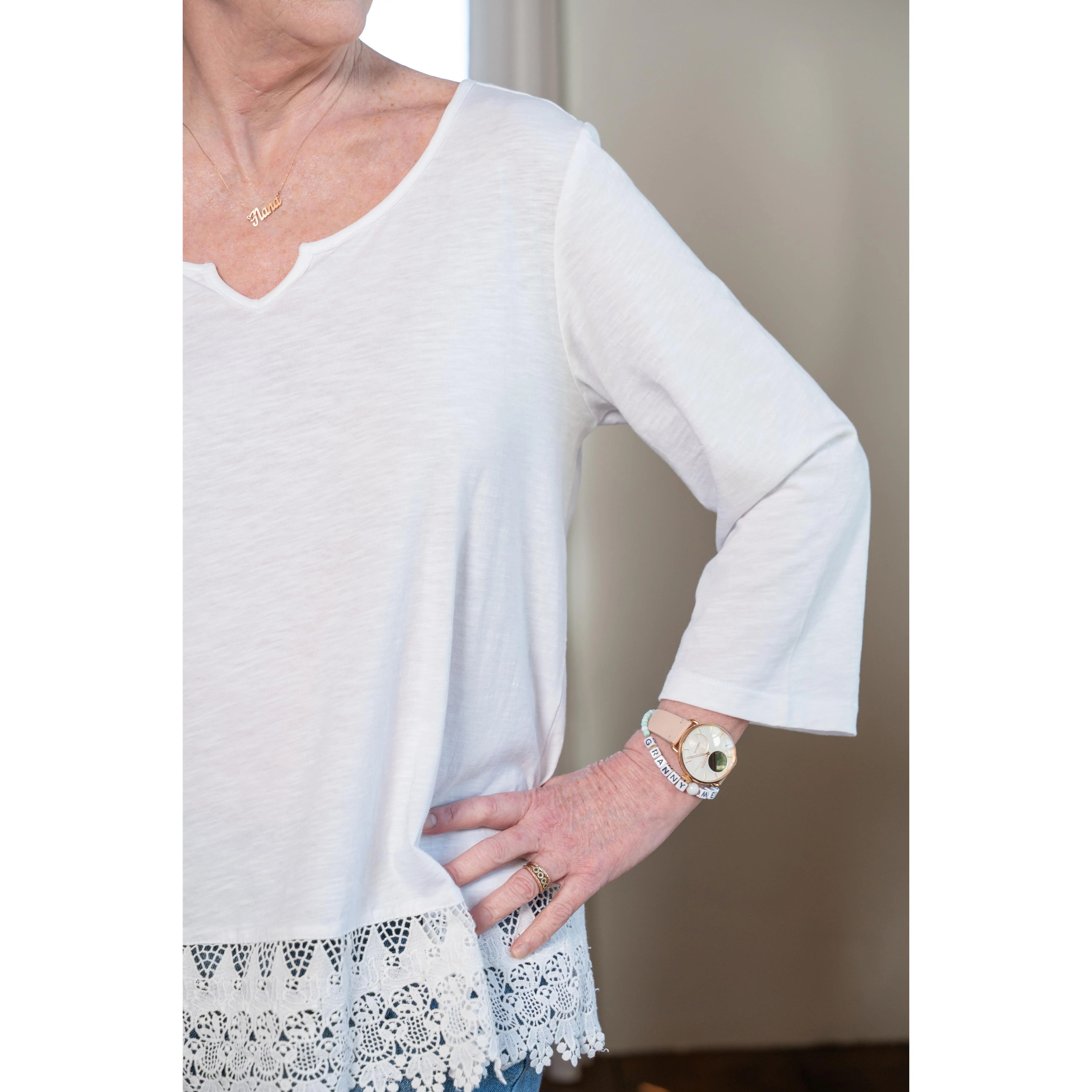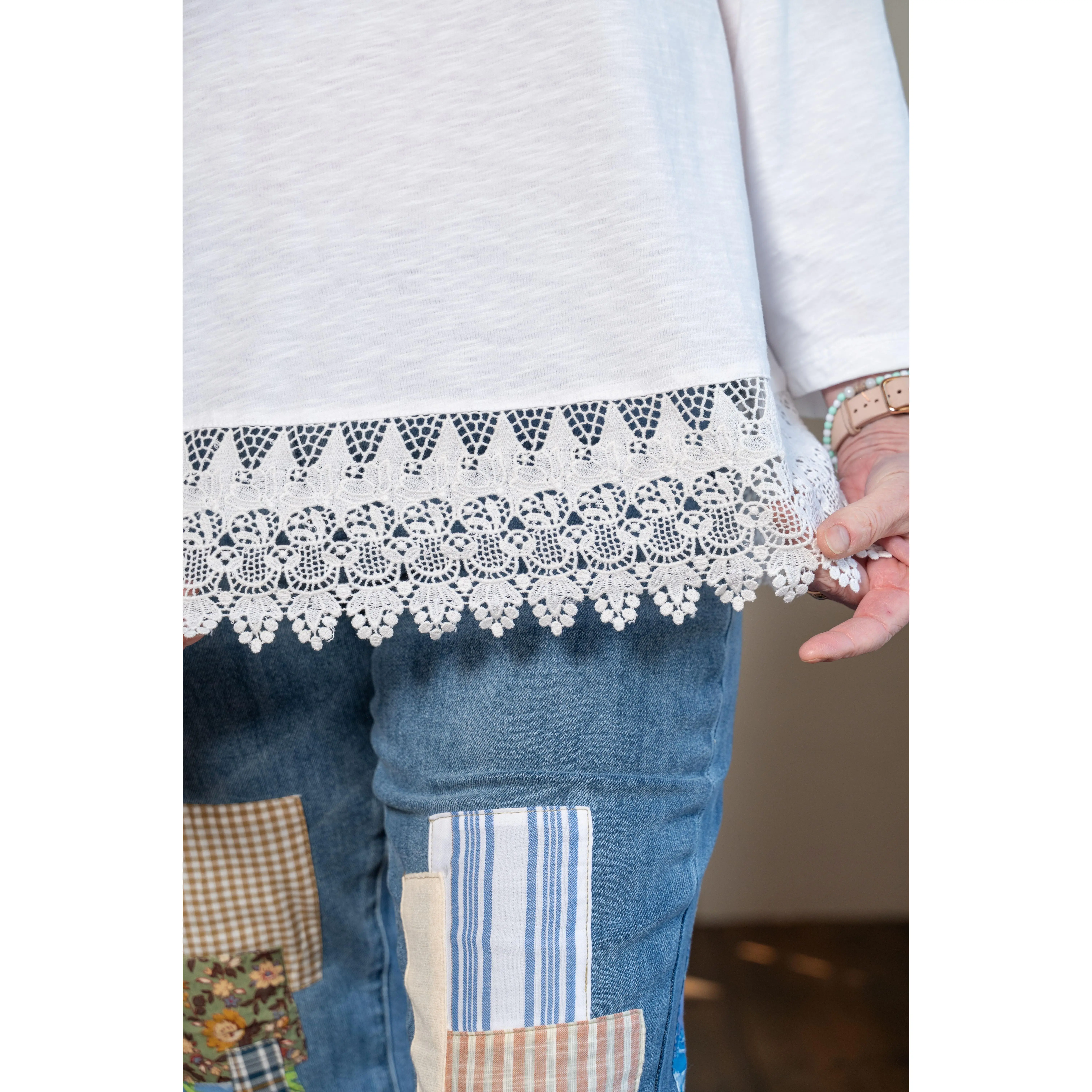 This is not your average tee! The Lovely Lacy Tee brings a feminine twist to a classic favorite with its scalloped lace trim and soft slub cotton texture. Made from 100% cotton, it’s breathable and lightweight—perfect for warm & breezy days. The relaxed silhouette hits at the hip with a notched neckline and 3/4 sleeves, giving you just the right amount of coverage. Pair it with denim, skirts, or overalls and let that delicate hem peek out. Easy, timeless, and truly pretty.