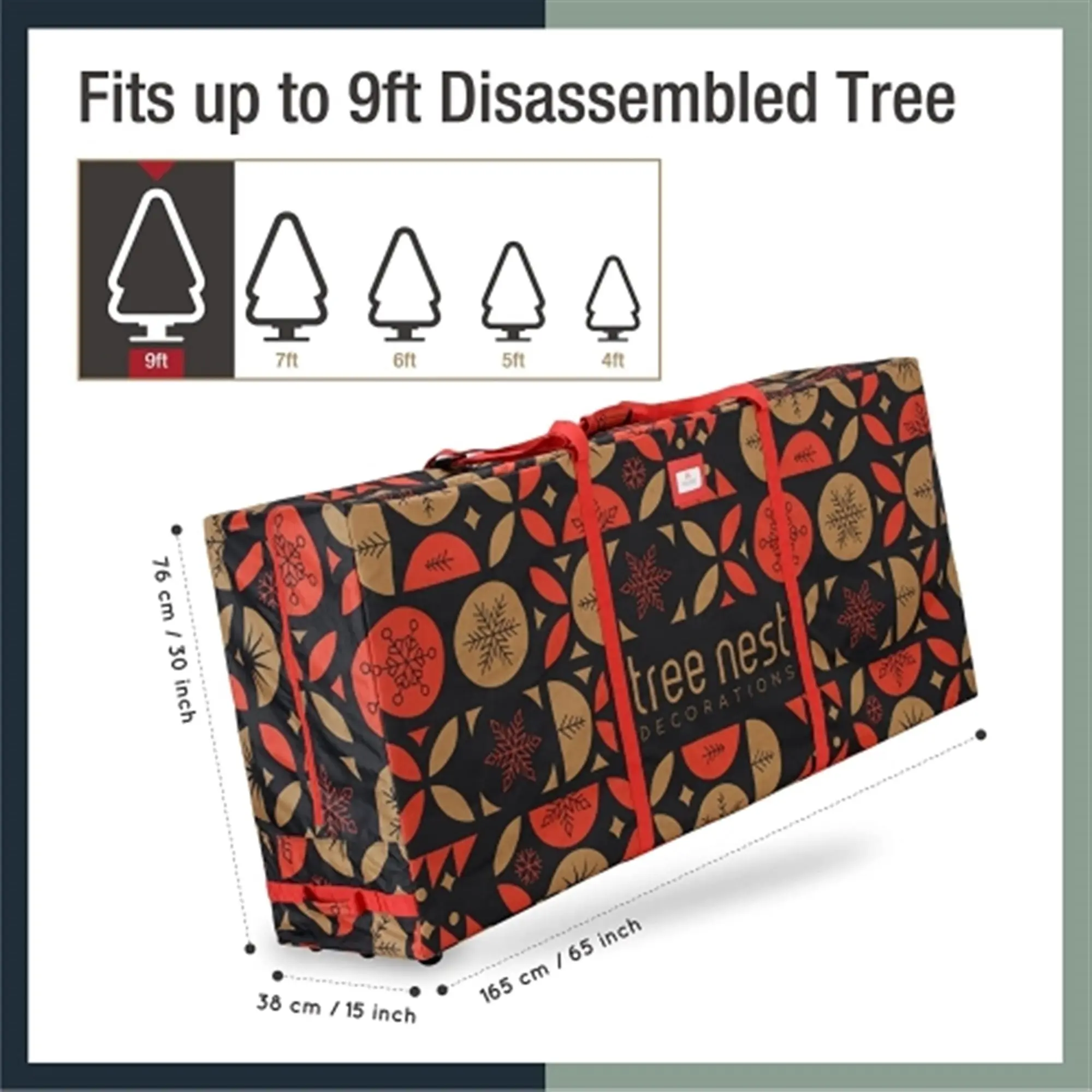 ·Dimensions: 65" L x 15" W x 30" H, largeenough to hold a 9-foot disassembled artificial Christmas tree (NOTE:SUPPORTING FRAME IS NOT INCLUDED)