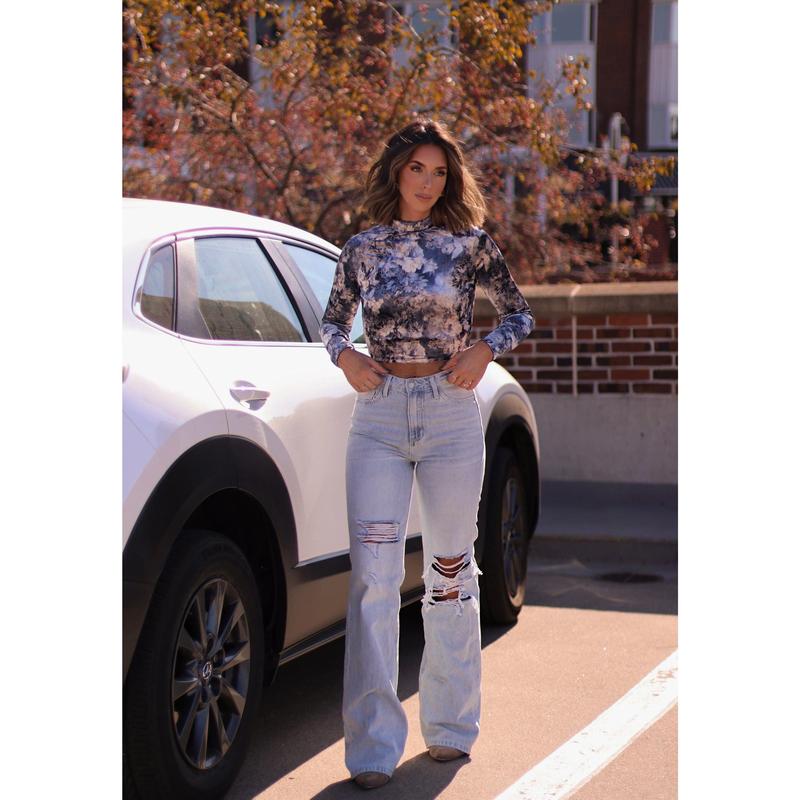 This Velvet Floral Mock Neck Top is both stylish and versatile. With a button closure on the neckline, it offers a customizable fit. The long sleeves and mock neck add sophistication, while the cropped length and velvet texture bring a touch of glamour. Perfect for any occasion.