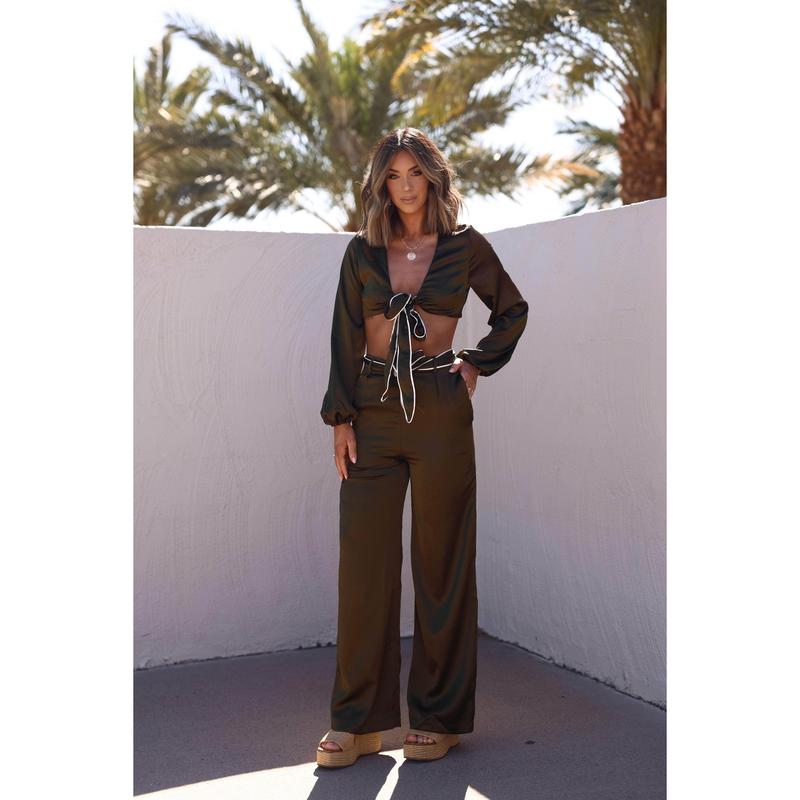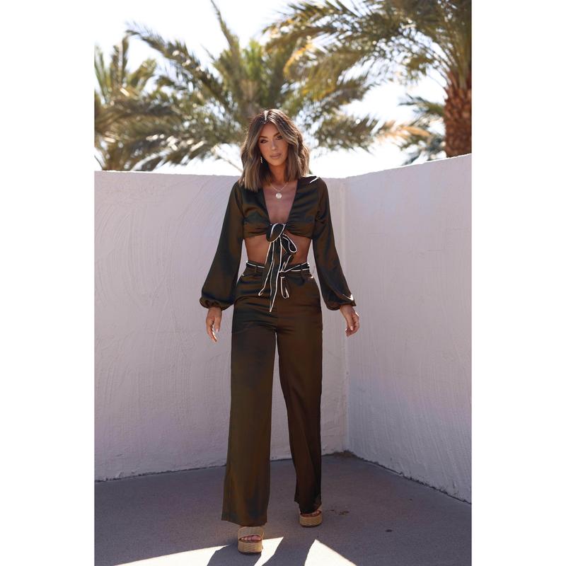 Embrace luxury with our Saint Lucia Satin Top. Featuring a front tie detail, open front, and v neckline, this top is perfect for dinner or drinks. The sleek satin fabric, trim detailing, and long sleeves add an elegant and elevated touch to your style. Whether for date night, vacation, or resort wear, it offers both comfort and sophistication.