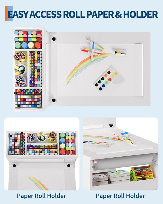 · Inspiring Features for Budding Young Artists: The craft table includes a top paper clamp to hold drawings securely in place as kids create. A concealed paper roll rod beneath lets children pull out fresh art paper effortlessly, adding ease and enjoyment