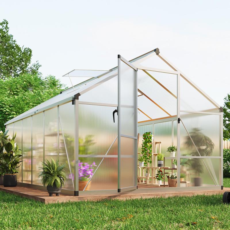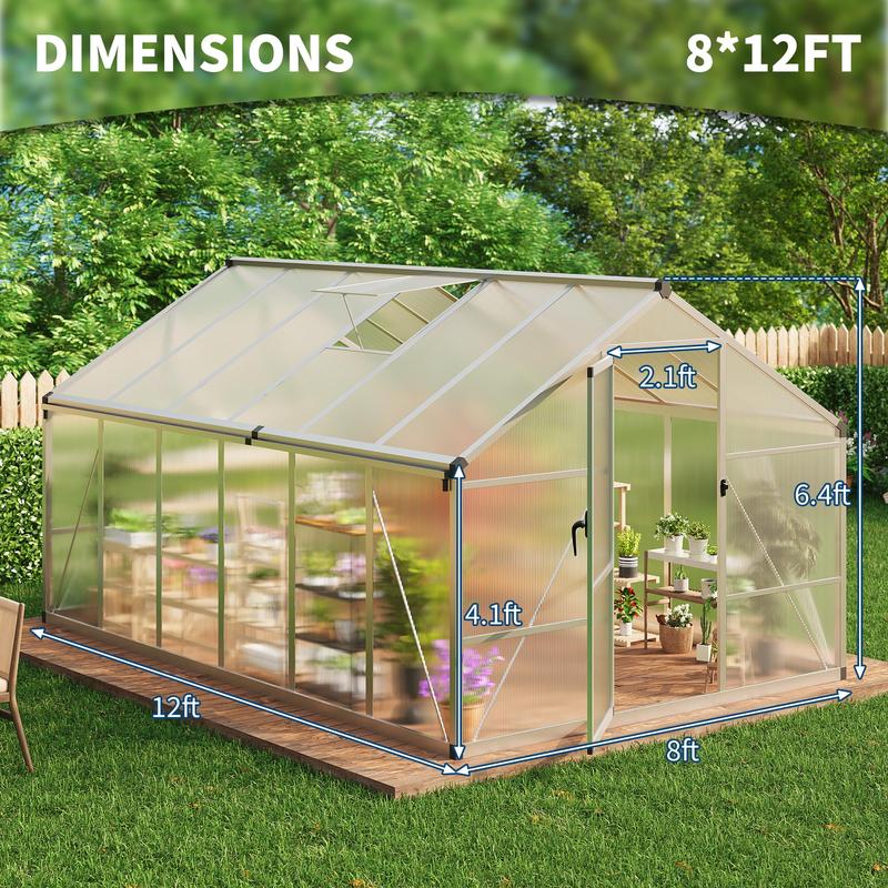 · 【Resilient Construction】Designed to endure challenging weather, our greenhouse features 720 g/m² polycarbonate panels and a solid aluminum steel frame. This design ensures stability and protection during heavy rain and gale. Keep your plants safe and thriving in a reliable greenhouse built to last.