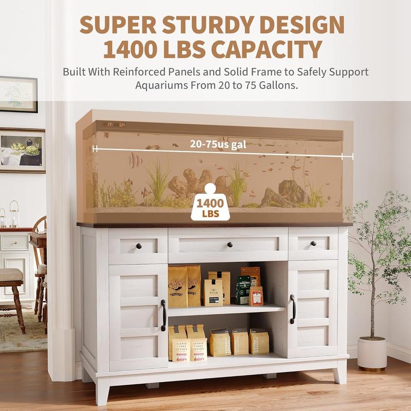 · 【Built for Strength & Stability】This heavy-duty aquarium stand is crafted from durable engineered wood and reinforced legs. The tabletop supports up to 1400 lbs, shelf storage 75 lbs, and bottom shelf 330 lbs, giving you total confidence for your 55–75 gallon fish tanks.
