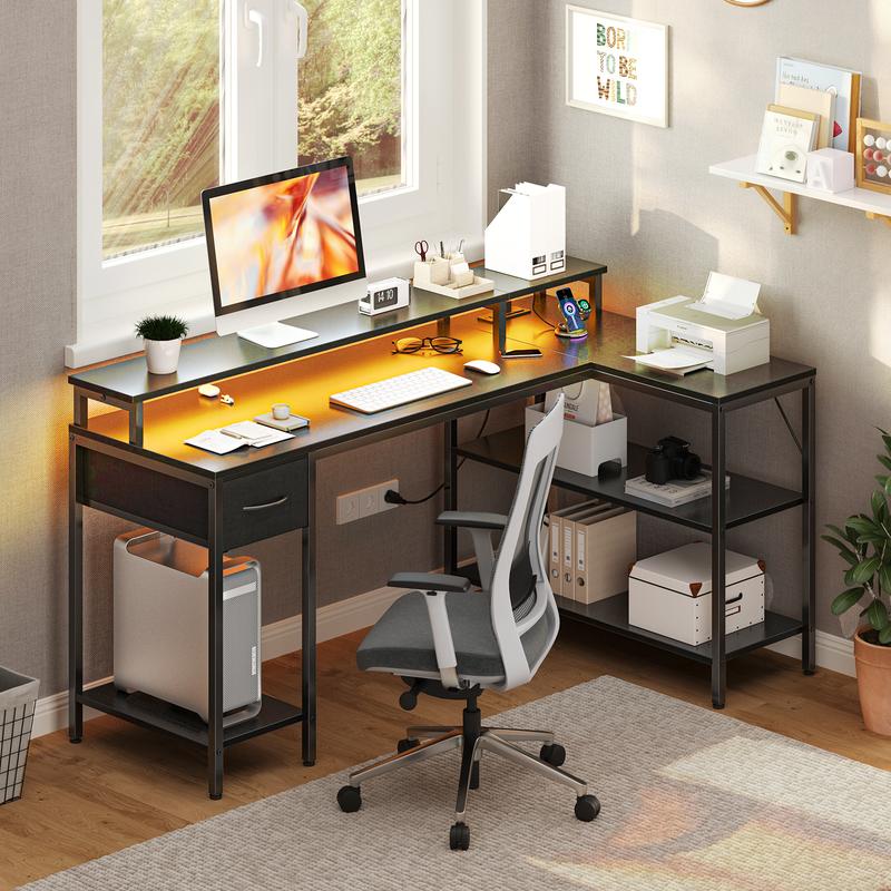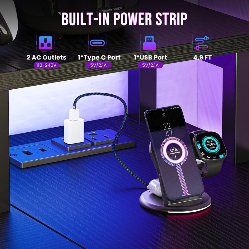 ·【Desk with LED Lights】Create the perfect ambiance for gaming or working with this computer desk. Choose from over 60,000 colors and enjoy the timing mode, mic mode, and music mode via the App. Alternatively, use the smart controller to switch between 12 scene modes, adjust speed levels, and set 3 brightness levels. Plus: The LED light strip needs to be plugged into a USB port to work
