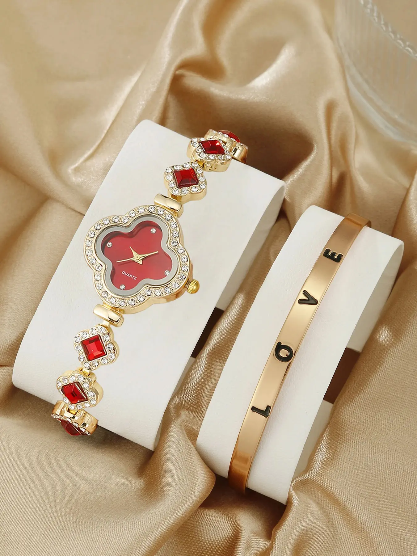 1pcs Love Full Diamond Casual Fashion Watch Female Quartz Student Watch Female Matching 4-piece Love Jewelry Set