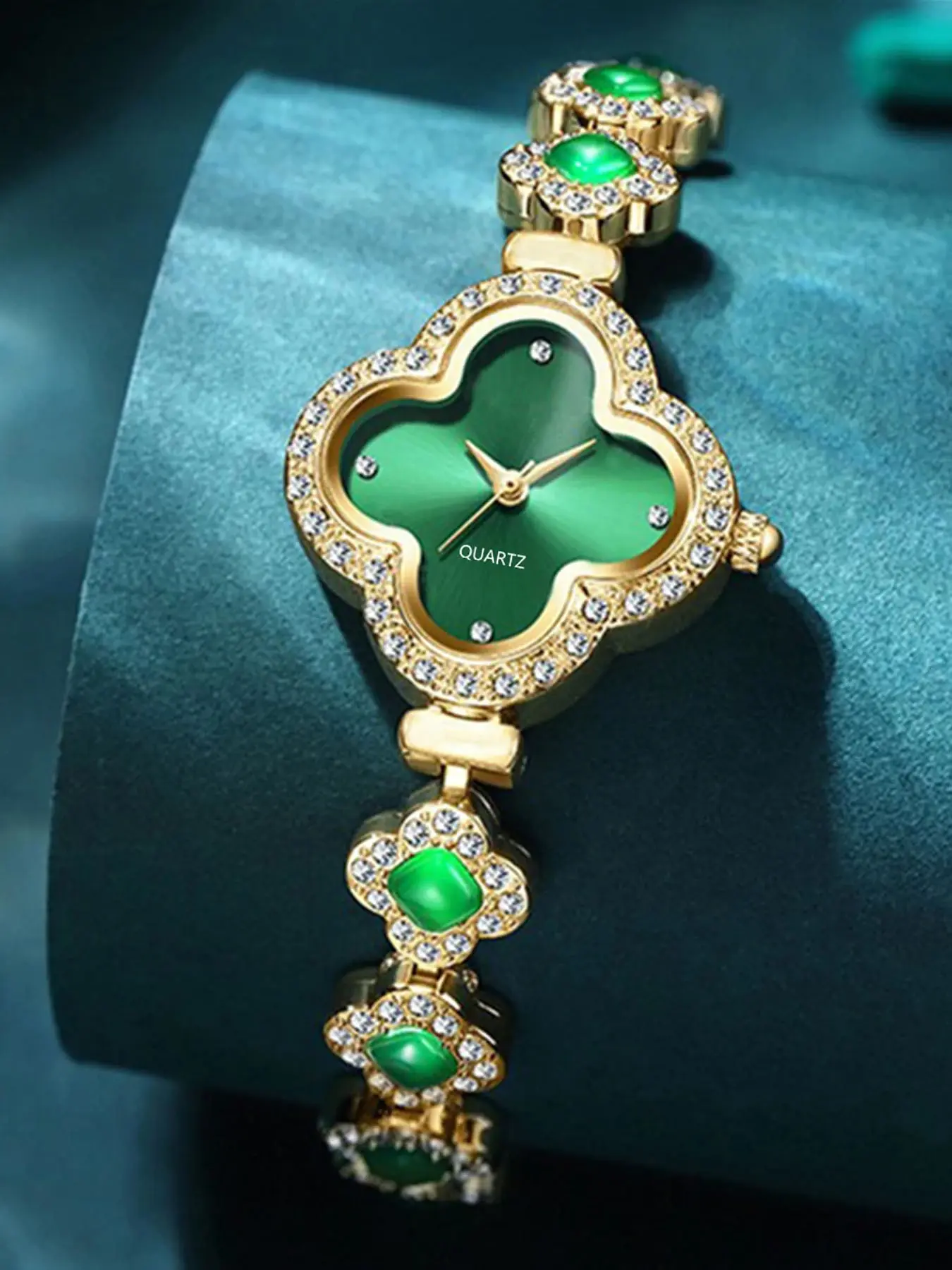2-Piece Fashion Clover Bracelet Quartz Watch Emerald Women's Watch
