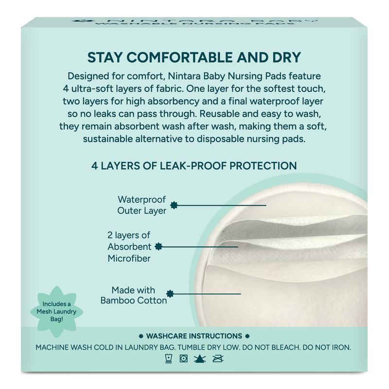 ·WASHABLE NURSING PADS: Nintara Baby's Nursing Pads feature 4 ultra-soft layers — a gentle top layer, two absorbent layers, and a waterproof backing to prevent leaks, providing comfort, dryness, and reliable protection for everyday use.