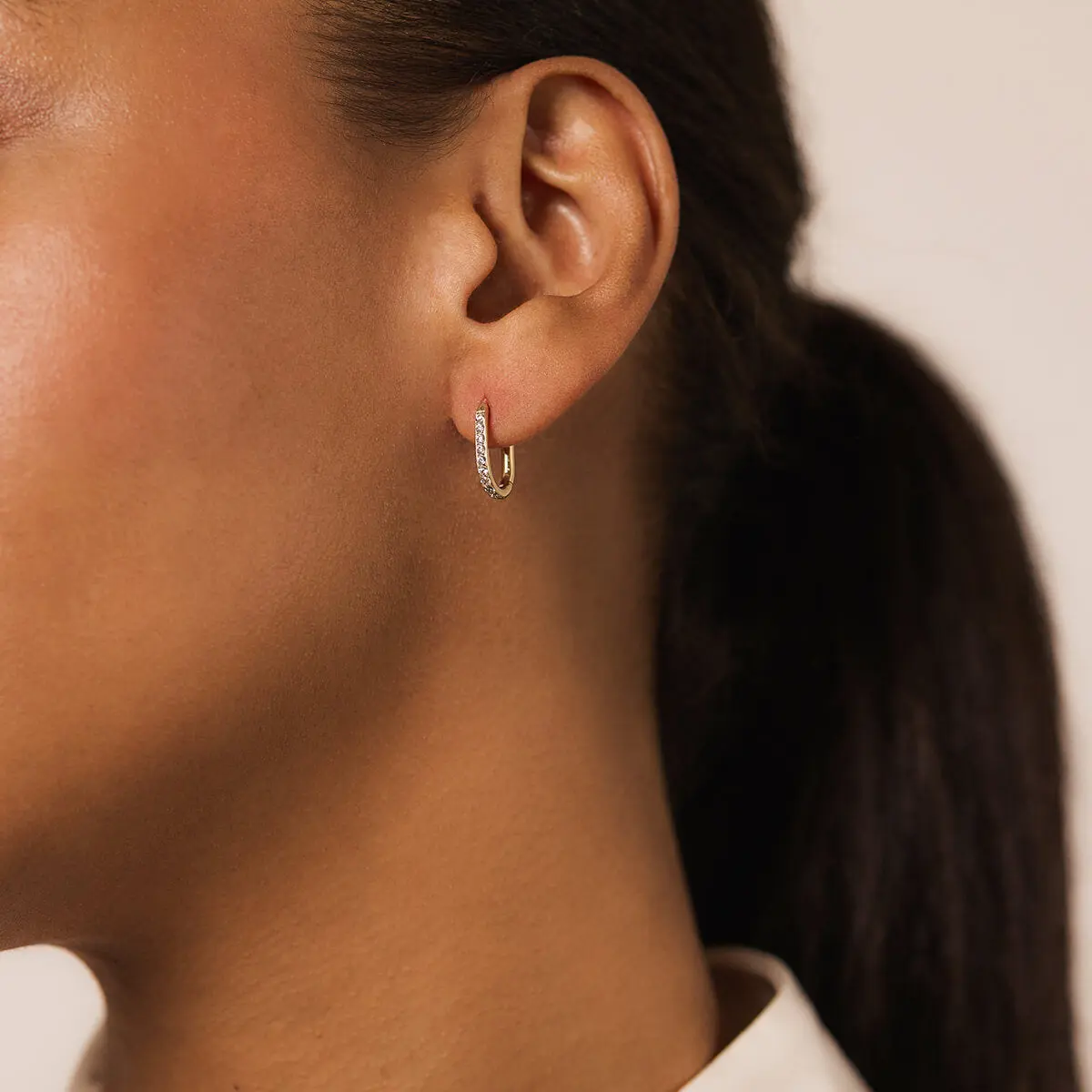 Our beloved oval silhouette meets endless sparkle in these delicate statement makers. Eternity Baby Halo Oval Hoops feature a continuous line of pavé-set crystals that wrap completely around the hoop—front to back—creating an unbroken circle of light that catches from every angle. The distinctive oval shape sits close to your ear, offering a modern alternative to traditional rounds while maintaining that barely-there feel. Crafted from medical-grade titanium, our hoops are safe for sensitive skin and designed for everyday sparkle.