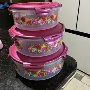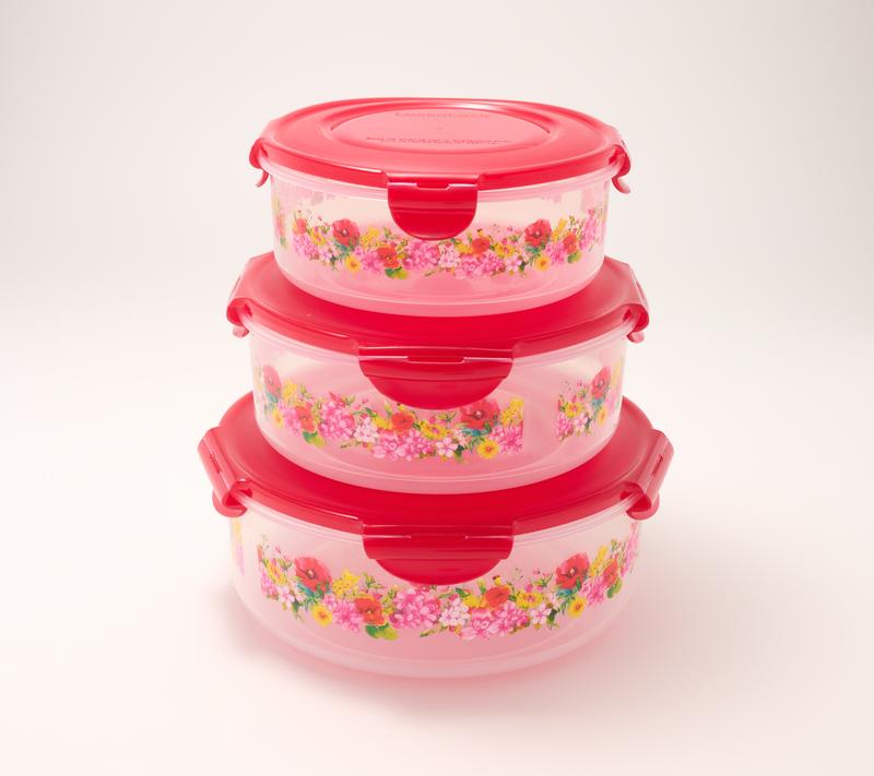 Organize snacks, dry goods, or baking supplies with this three-piece set of nestable floral canisters. Each canister features a vibrant lid and clear printed body, making it easy to spot ingredients and add a cheerful touch to your kitchen shelf or pantry. Multiple sizes offer flexible storage options to keep your essentials accessible and beautifully displayed. From LocknLock.