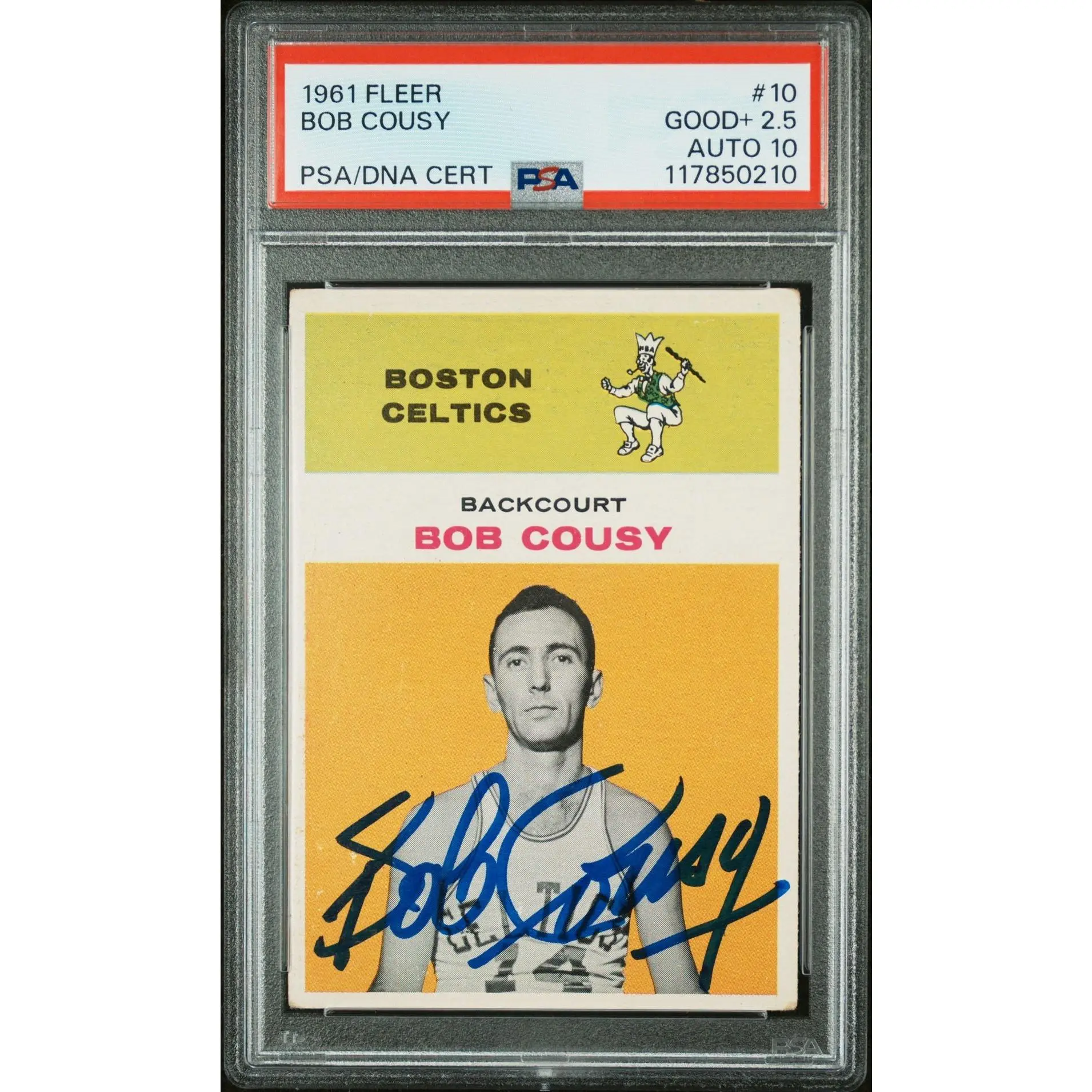 Fleer Bob Cousy 1961 Signed Basketball Card #10 Graded PSA 2.5 Auto 10 Cert # 117850210 Encapsulated Hall of Fame Guard Boston Celtics