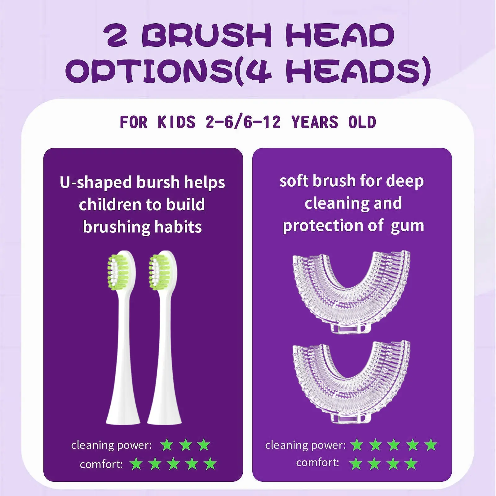 ·Two Options: Food-grade silicone brush head,U-shaped design is perfect for toddlers and kid's teeth,soft silicone, providing a comfortable brushing sensation,thus developing healthy brushing habits,with the soft brush head for more efficient deep cleaning