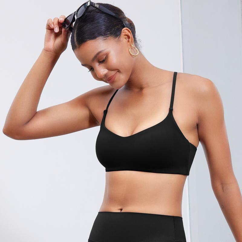 ·Womens Sports Bras: V-neck, elastic underbust, adjustable straps, low support, spaghetti straps, removable padded cups. If you are between sizes, we recommend sizing up