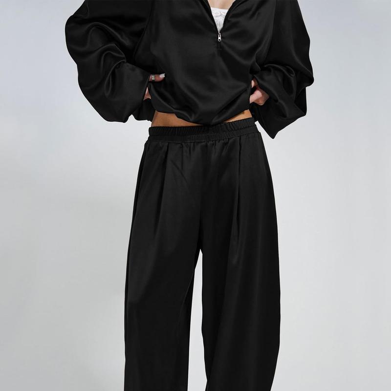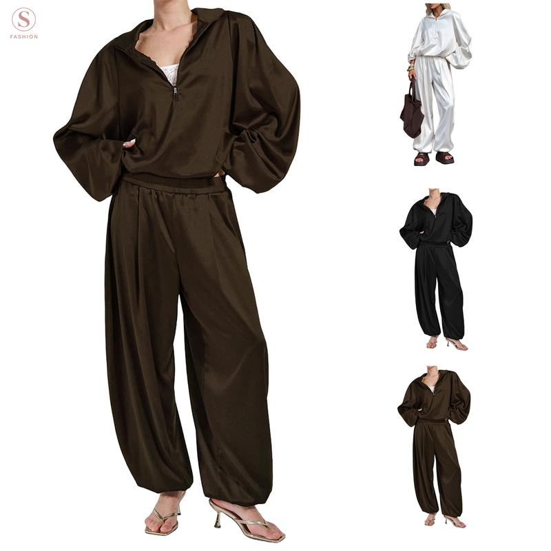 Elevate your loungewear with the SHEEN Womens Zip 2 Piece Outfit Set. This set includes a silky long sleeve top and matching joggers, perfect for comfort and style. The silk satin material adds a touch of elegance to your everyday wear. Ideal for lounging or casual outings, this tracksuit is a versatile addition to your wardrobe.