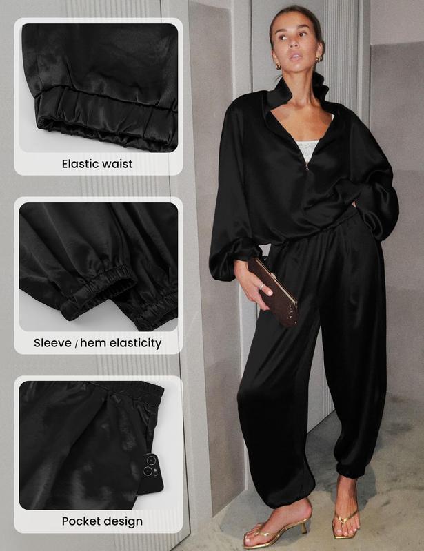 5. Yimoon Womens Zip 2 Piece Outfit Set Silk Satin Lounge Set Silky Long Sleeve Top Joggers Tracksuit Sweatsuit