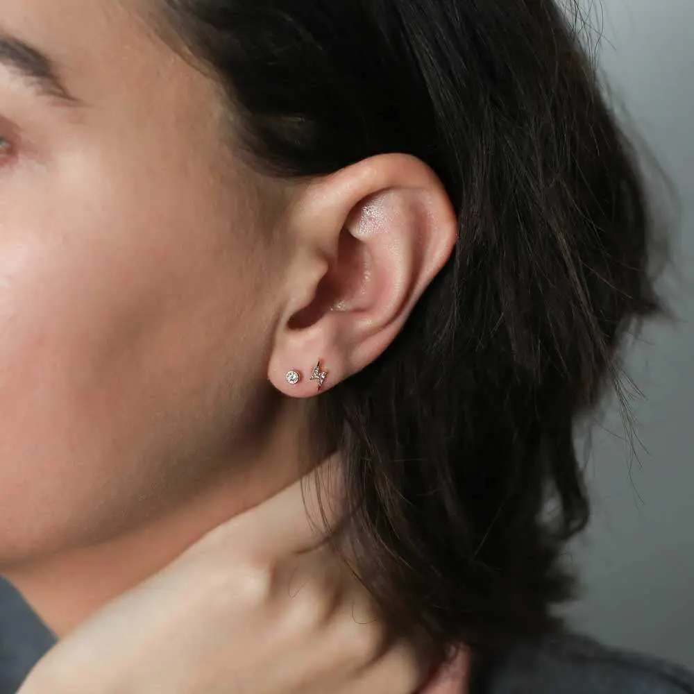 Our tiny Pave Lightning Push Pin Flat Back Earring, a little bolt of inspiration and energy to carry with you wherever you go, is now available in a threadless push pin flat back style so you can wear it in your cartilage piercings (like a tragus, conch, daith, or helix) - or your standard lobe piercing (in the 20g size).