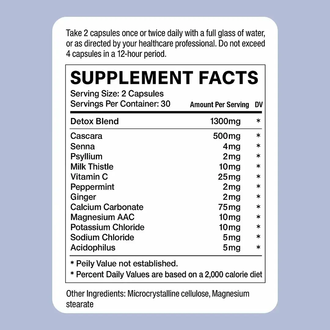 Psyllium (2mg) A gentle soluble fiber that supports regularity and healthy elimination helping the body move metabolic waste out efficiently rather than allowing it to recirculate.*