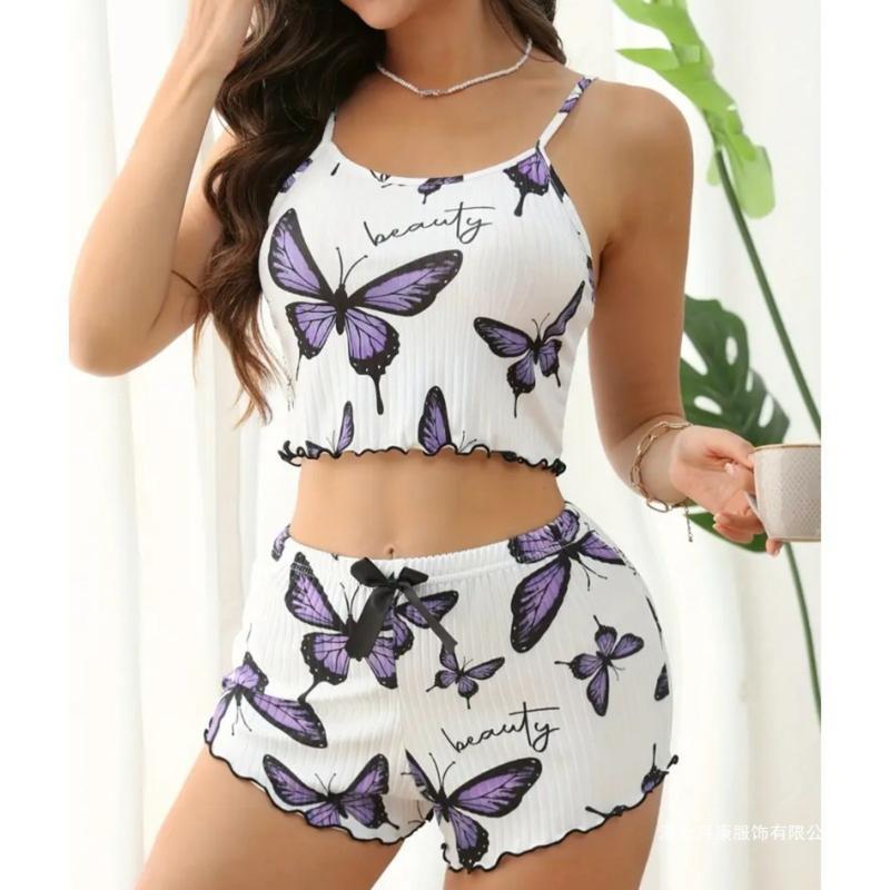 Butterfly Print Two-Piece Set Charming Loungewear Set A delightful two-piece set featuring an all-over butterfly print. The set includes a short-sleeve or sleeveless top with attached suspenders and matching shorts. Perfect for relaxing or casual wear, this outfit offers a cute and comfortable look. Key Features Whimsical Butterfly Print: Delicate butterfly pattern for a sweet, dreamy aesthetic. Adjustable Suspenders: Functional suspenders attach to high-waisted shorts, adding a playful retro touch. Soft Fabric: Made from breathable, soft material like cotton or a cotton blend for ultimate comfort. Versatile Loungewear Designed for cozy nights in and stylish at-home gatherings. Ideal for sleep, leisurely weekends, summer lounging, or as a thoughtful gift. Blends comfort with playful style. Perfect for Sleep, leisurely weekends, summer lounging, or as a gift. A delightful set that combines comfort and playful style.