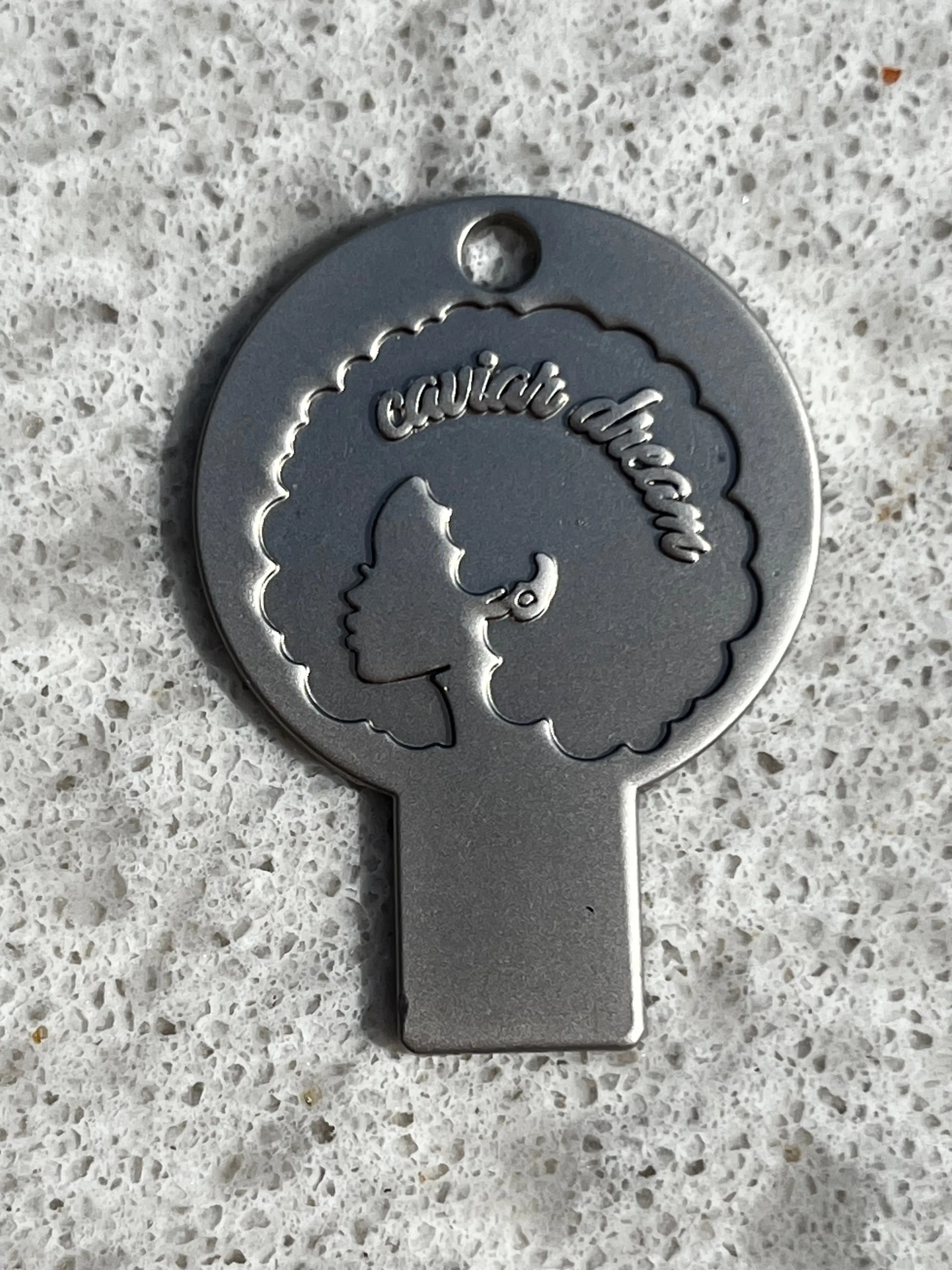 A silver, circular key with the our icon, Dominique, front + center for all to see when you when you start poppin' tins. You'll want to keep this key close by or your friends may snatch it when you're not looking!