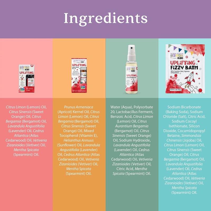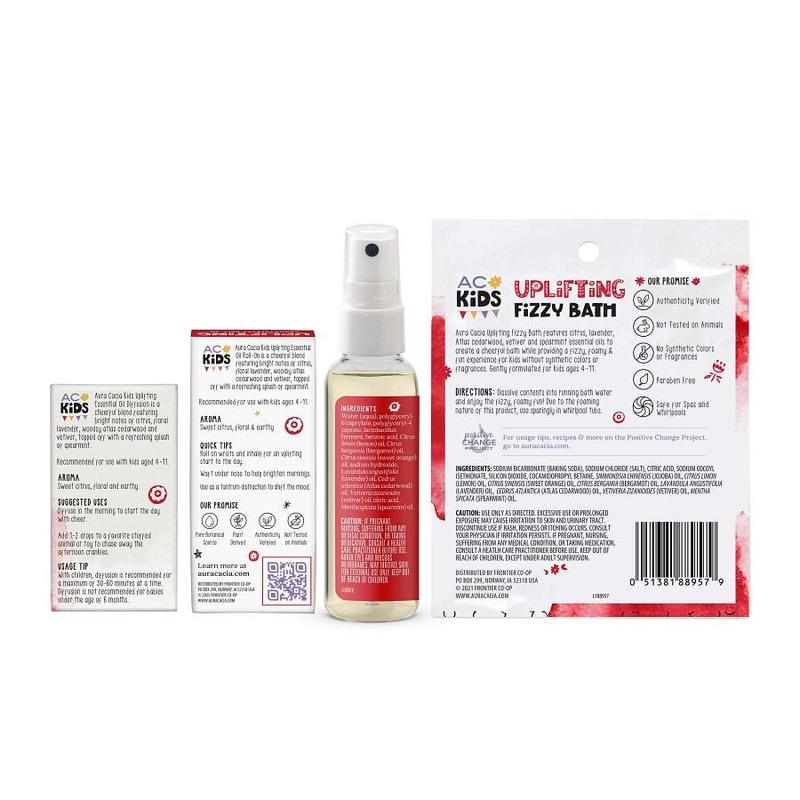 ·Kids Uplifting Fizzy Bath, 2.5 Oz — Delight in an uplifting bath experience with Aura Cacia Kids Uplifting Fizzy Bath! Featuring citrus, lavender, atlas cedarwood, vetiver and spearmint essential oils to create a cheerful bath while providing a fizzy, foamy & fun experience for kids.
