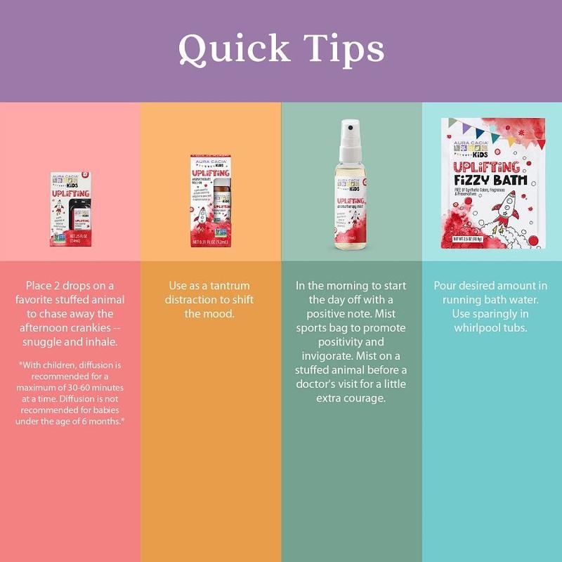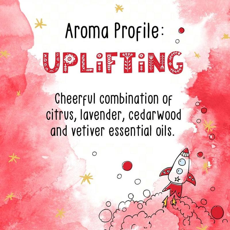 ·Kids Uplifting Essential Oil (Boxed), 0.25 Fl Oz — A cheerful pure essential oil blend that is uplifting and features bright notes of citrus oils, floral lavender oil, woodsy atlas cedarwood and vetiver, topped off with a refreshing splash of spearmint. Usage Tip: With children, diffusion is recommended for a maximum of 30-60 minutes at a time. Diffusion is not recommended for babies under the age of 6 months.