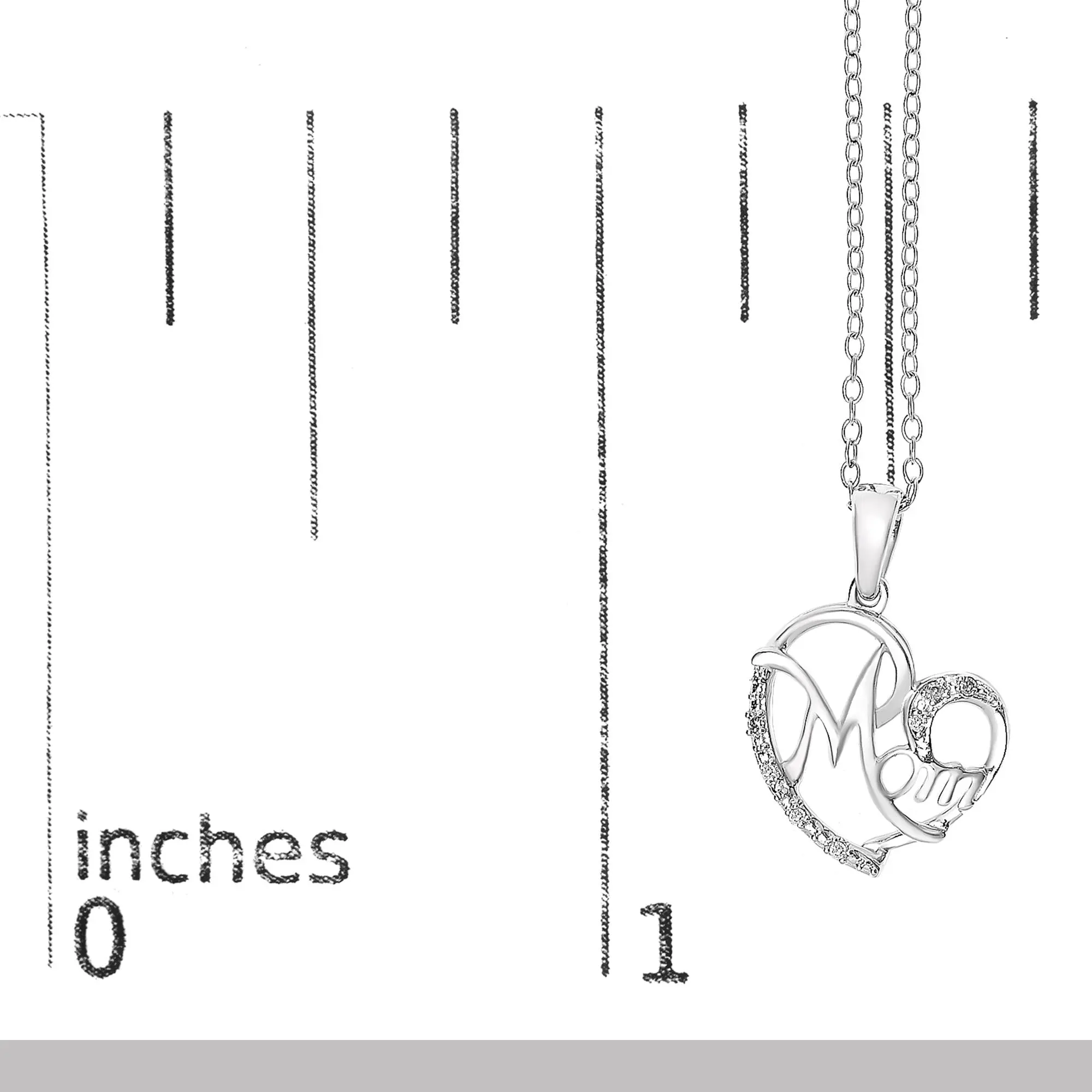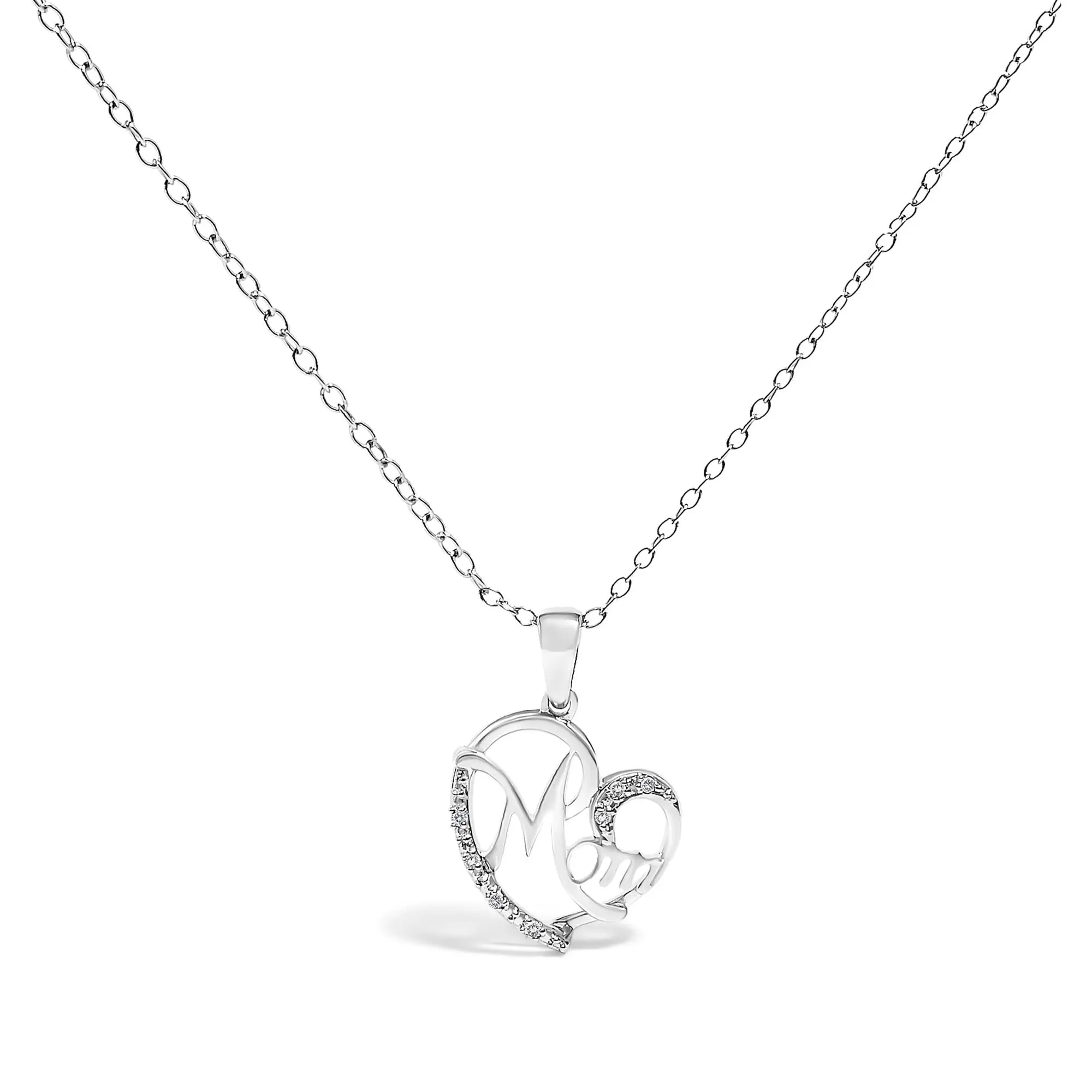 Draped in elegance and heartfelt sentiment, this exquisite necklace pays homage to the cherished word 'Mom', etched in a cursive embrace within a sterling silver heart, polished to a mirror-like sheen with rhodium. Natural diamonds, seven in count, twinkle along the delicate contours, summing up to 0.05 carats of J-K color and I2-I3 clarity, embedding sparks of love with every glance. Nestled on a refined 18-inch rope-style chain and secured by a spring-ring clasp, this pendant exudes grace and appreciation, making it an impeccable tribute to the unparalleled bond shared with a mother. Perfectly sized and crafted to be treasured, it serves as an ever-present reminder of affection and adoration.