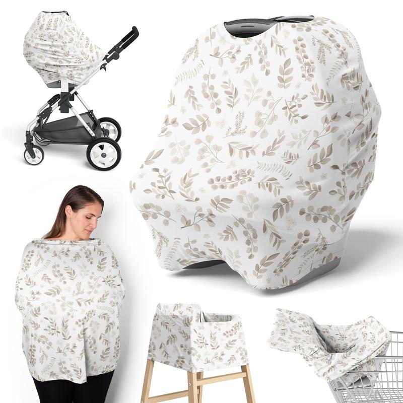 The stylish 5 in 1 baby cover by Sweet Jojo Designs makes the perfect versatile wrap that can be used for all your newborn essentials. This baby canopy can be used as a infant carseat cover or baby stroller cover to protect your little one from wind and provide shade as the infant car seat cover fits snuggly around your infant carrier to provide 360 degree coverage. Used as a infant nursing cover, slip the multi use baby nursing poncho over you and your infant during public meal times. Not only is it a baby breastfeeding cover for public feeding times, but it can also be used as a restaurant high chair cover for a clean and easy surface. The multi use cover can also be used as a grocery cart cover to protect your child, while also making it comfortable for your bundle of joy during shopping trips. Gift this 5 in 1 cover to expectant mom’s and dad’s or add to your registry to ensure you get this adorable baby cart cover that can also be used as a fashionable infinity scarf at your baby shower. 5 in 1 Multi Use Baby Cover Measures 28in. x 28in. 95% Rayon/5% Spandex Jersey Stretch Knit - Machine wash cold, tumble dry low. Featuring exclusive fabric of botanical bohemian taupe and beige watercolor boho woodland floral leaves. This soft and stretchy multi use baby car seat canopy and nursing cover will be your next newborn essential. The 5 in 1 cover makes the perfect baby car seat cover, baby nursing cover, breastfeeding cover, baby high chair cover, baby shopping cart cover, infant stroller cover, baby carrier cover, infinity scarf and much more for both you and your infant. Makes the perfect gift to coordinate with Sweet Jojo Designs nursery bedding, crib sheets, changing pad covers, nursing pillow covers, room decor and baby carseat covers. This is a great nursery gift for baby shower gifts, christenings, and gender reveals. Please note: should be removed while child is sleeping or unsupervised.
