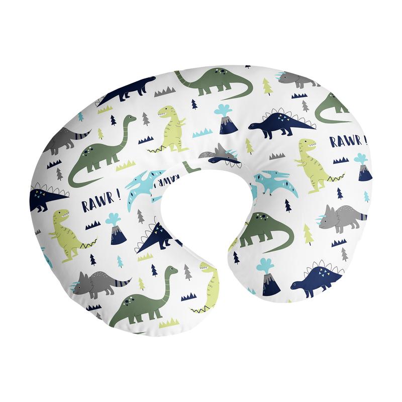 Protect your nursing pillow with a Sweet Jojo Designs nursing pillow cover. We've put extra thought into the design to ensure that our breastfeeding pillow covers are easy to slip on and off your standard nursing pillow for washes as needed. Each features a hidden zipper and uses our exclusive stretchy jersey fabrics to coordinate with our crib bedding sets, crib sheets, changing pad covers, and room decor accessories to give you a complete look for your nursery. Our versatile slipcovers fits most standard nursing pillows which help care takers hold your baby during feedings and will support your little one during supervised awake time as they grow and experience first year milestones. Our feeding and infant support pillowcases are made from soft durable fabrics and are machine washable, so no matter what messes may happen, you can easily wash it off in your regular washing cycle. They also make the perfect baby shower gift for parents welcoming a new addition to their family. 25.25 in. x 17.25 in. – Cover Fits Most Standard Shaped Nursing Pillows COVER ONLY – PILLOW NOT INCLUDED 95% Rayon / 5% Spandex Jersey Stretch Knit featuring blue, green, and grey dinosaurs Hidden Zipper for Style and Comfort. Machine wash cold, tumble dry low. Please note: Nursing pillows are NOT intended for sleep. They should only be used while baby is awake and being supervised by an adult.