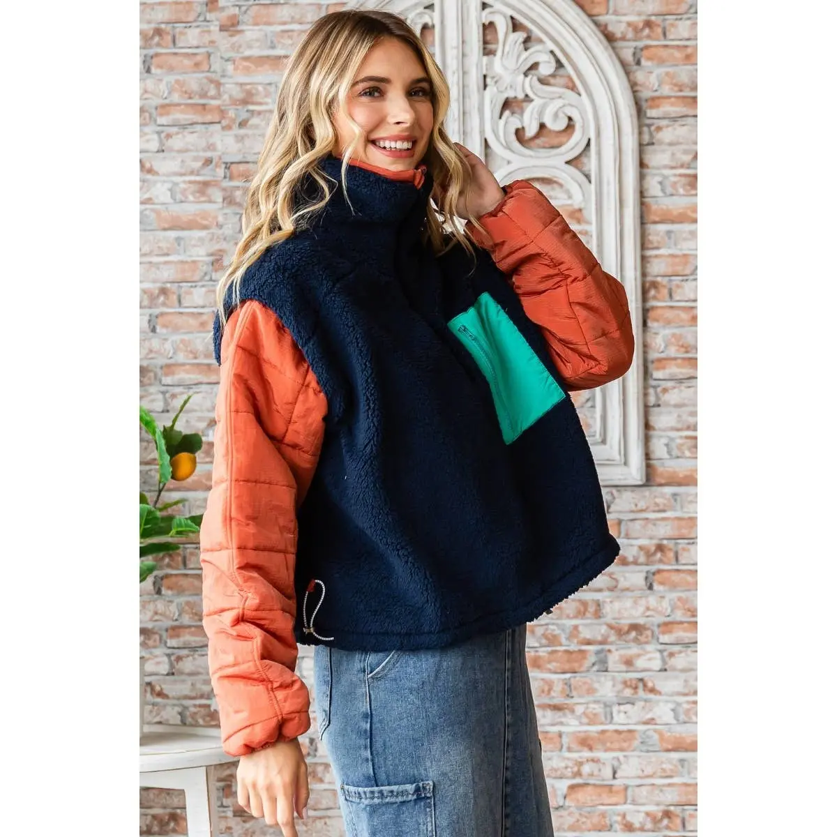 Cozy meets elevated in this must-have pullover. Designed with an ultra-soft sherpa fleece body and quilted puffer sleeves, this piece brings warmth, texture, and style together effortlessly. The half zip-up neckline allows for adjustable comfort, while the contrast chest zip pocket adds a functional, modern touch. Finished with elastic sleeve cuffs, this pullover is perfect for layering on chilly days or wearing on its own for a relaxed yet put-together look.