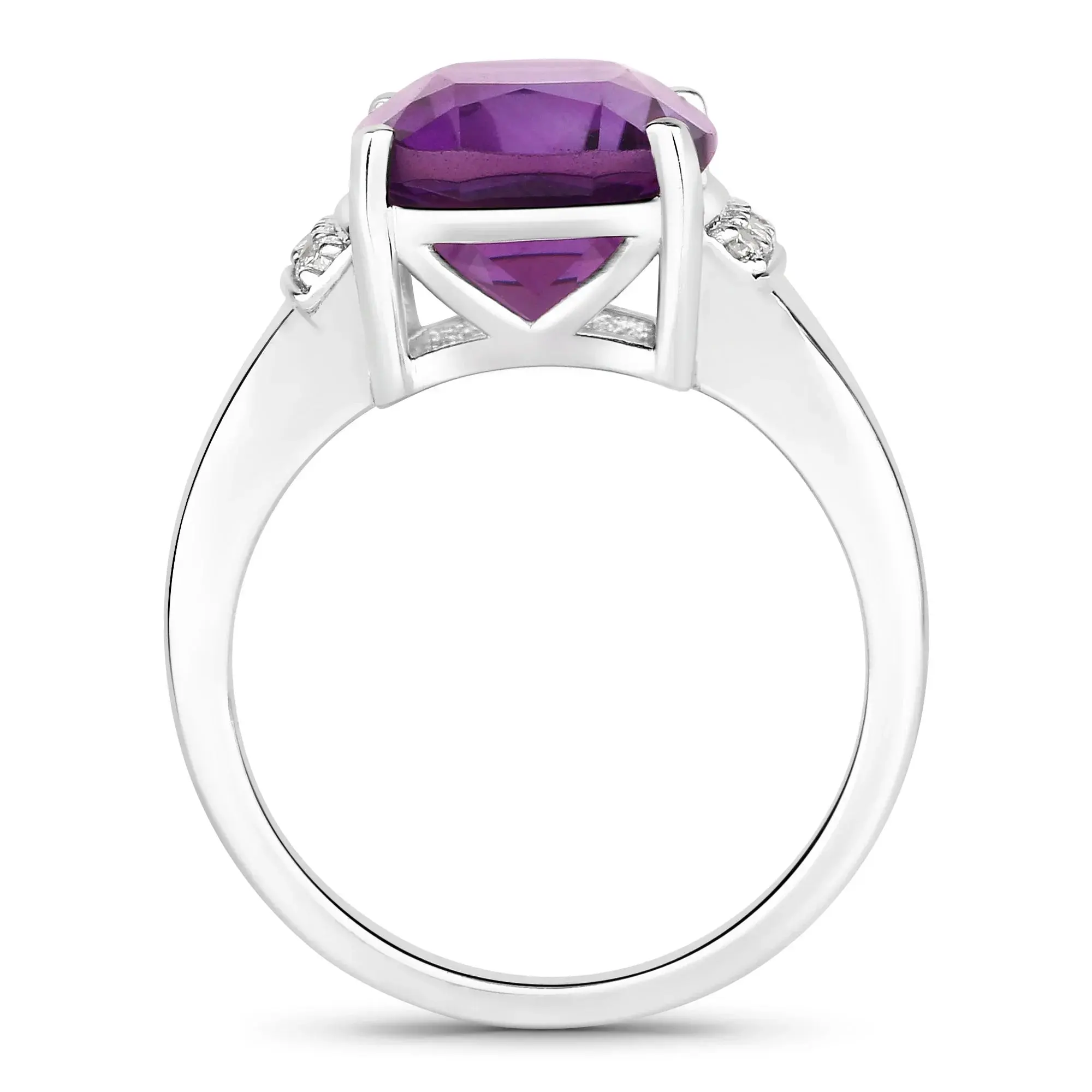 Crafted in 925 sterling silver and finished with rhodium plating, this amethyst and diamond cocktail ring features a natural cushion-cut amethyst, measuring 12x10 mm and weighing 4.20 carats total weight. The stone is prong-set for secure placement and maximum clarity. Surrounding the amethyst are 10 round lab-grown diamonds, each 1.50 mm, totaling 0.14 carats of accent sparkle. The total stone weight reaches 4.34 carats, and the piece weighs 5.87 grams, offering a solid but wearable profile.