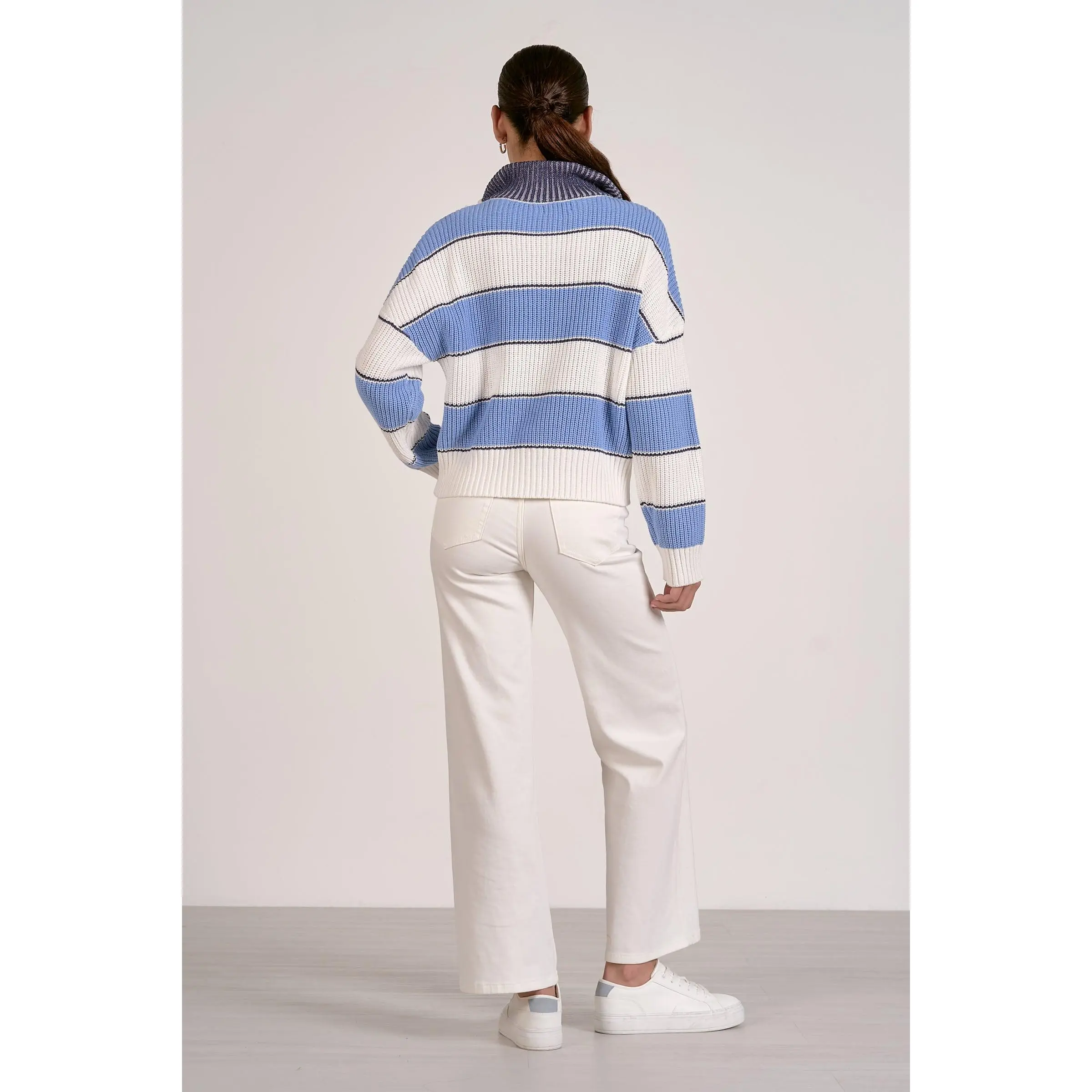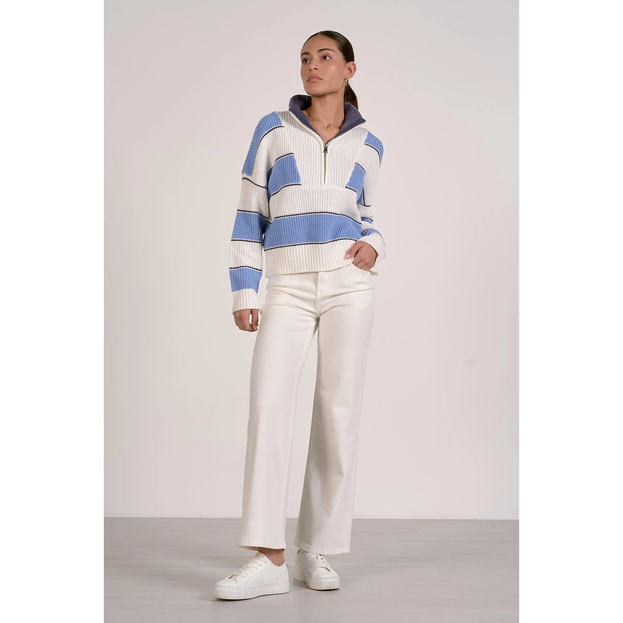Elevate your casual wardrobe with this classic rugby-striped half-zip sweater, featuring bold blue and white stripes that effortlessly blend style with versatility. The convenient half-zip design allows you to adjust your comfort level throughout the day, making it perfect for layering or wearing solo. Crafted for a relaxed fit, this sweater transitions seamlessly from weekend outings to relaxed office settings. Whether you're pairing it with jeans for a laid-back look or dressing it up with chinos, this timeless piece delivers the comfort and sophistication you've been searching for.
