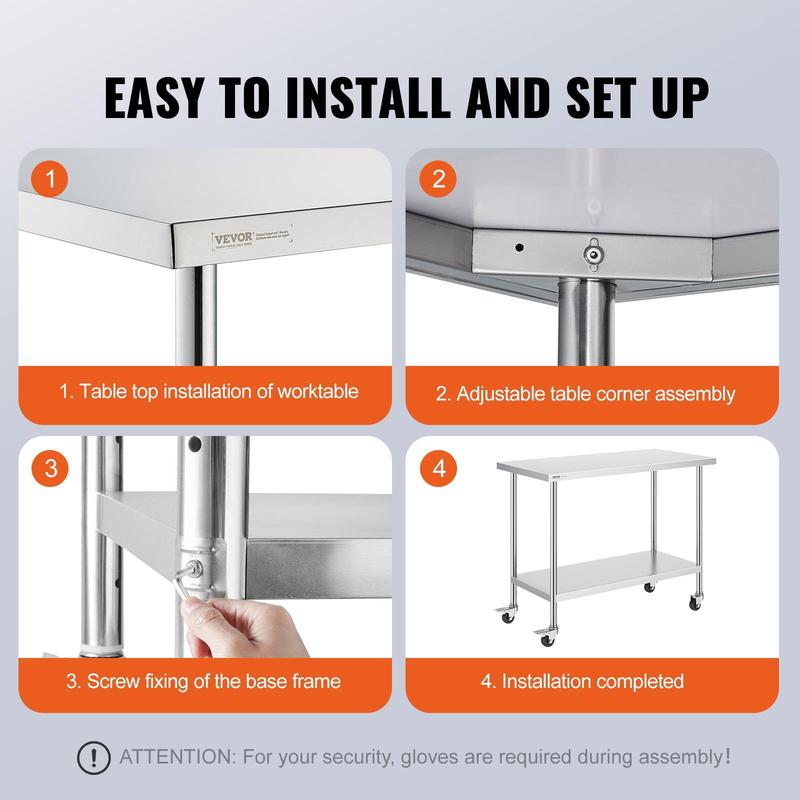 • High-Quality Stainless Steel: This work table, measuring 24 x 48 x 38 inch, is made from SUS201 stainless steel for the tabletop, shelves, and legs. It offers superior rust resistance, a sleek appearance, and a smooth surface that is easy to clean with a simple wipe. NSF certified, it meets strict public health standards, ensuring long-lasting protection for your health.